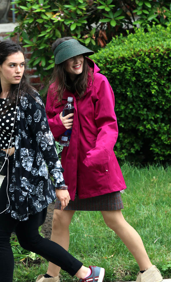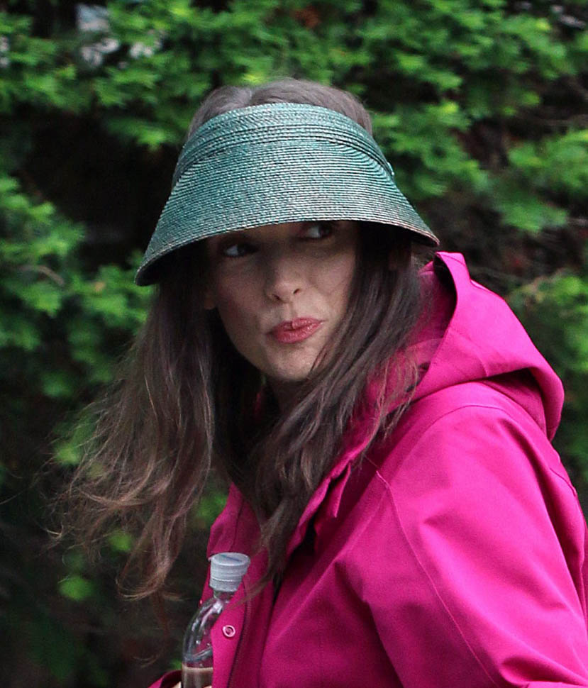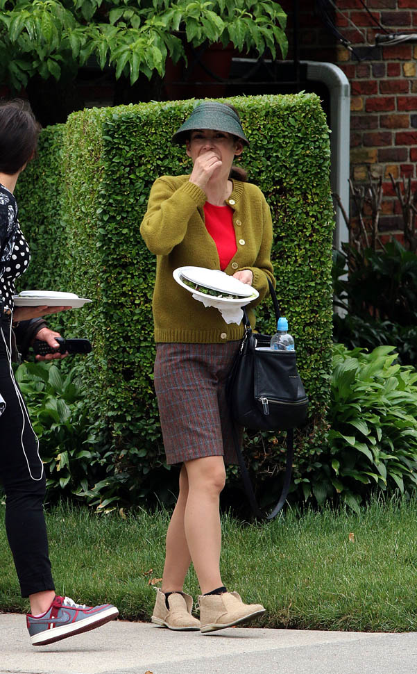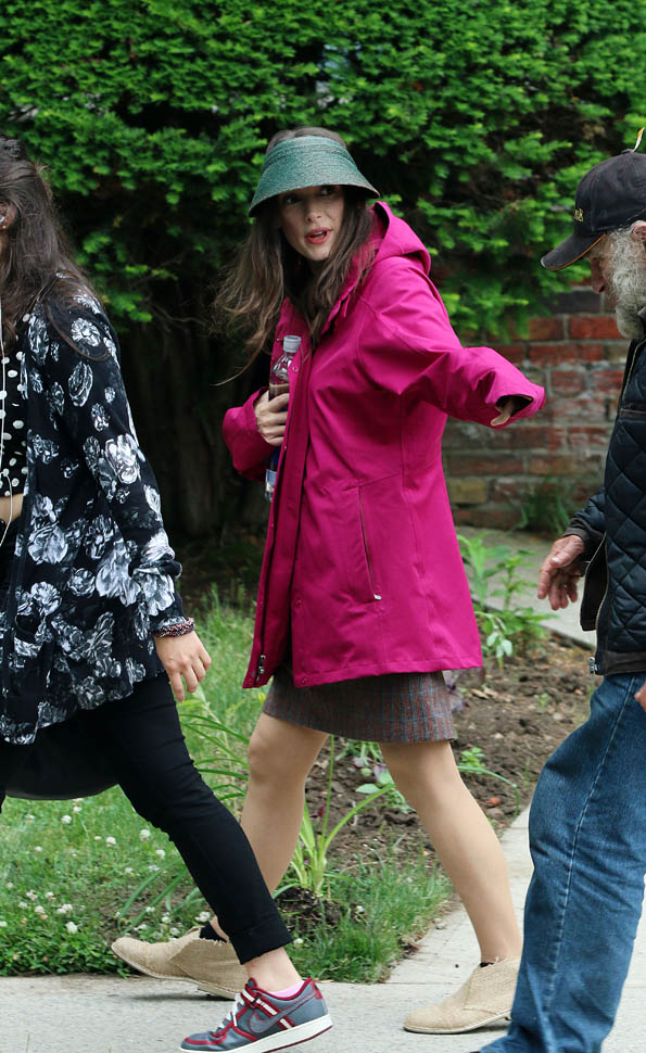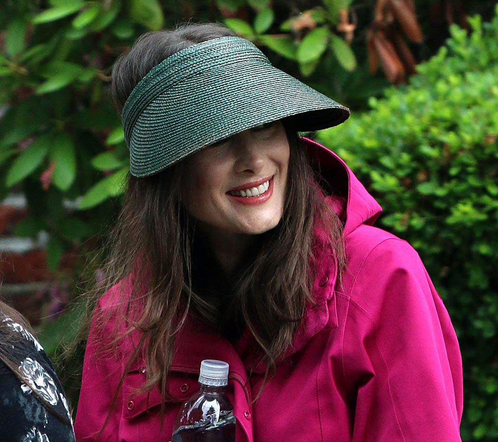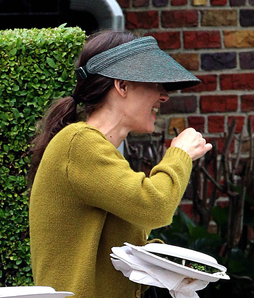 Now check out Winona Ryder on the set of her new movie Experimenter in New York. At first I thought maybe the visor was part of her costume but then she was still wearing it on lunch break.