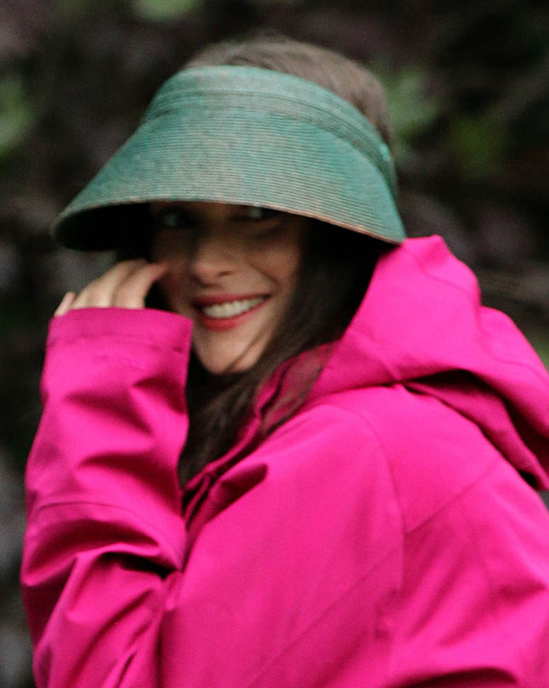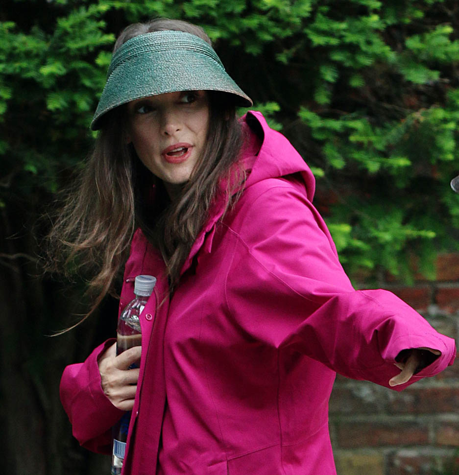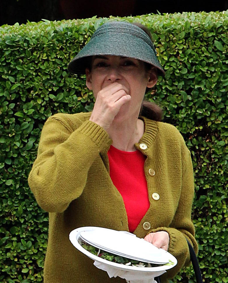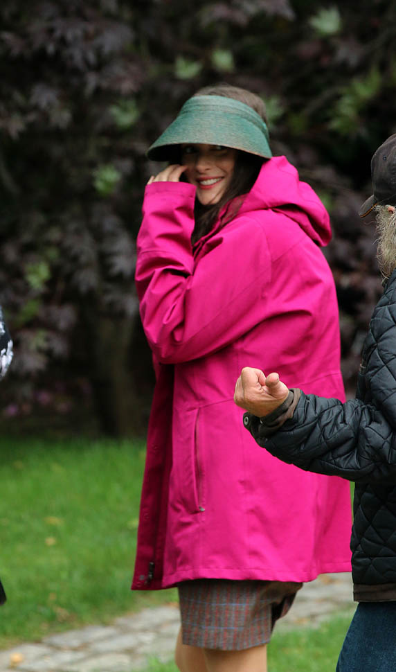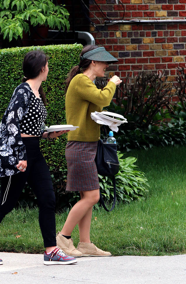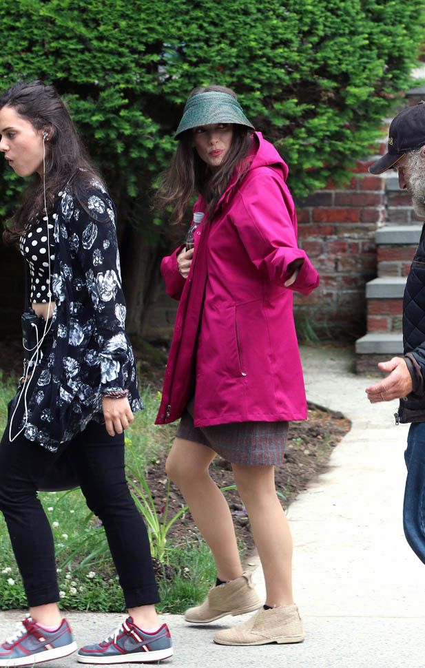 Now check out Winona Ryder on the set of her new movie Experimenter in New York. At first I thought maybe the visor was part of her costume but then she was still wearing it on lunch break.