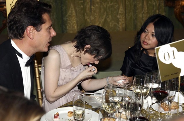 But Winona tried to clean up last night for the Marie Claire Prix De La Mode 2008 fashion awards party in Madrid and she did look great. Almost a healthy flush and still as pretty as ever. She was honoured alongside Alberta Ferretti, model Sasha Pivovarova and Paz Vega which, I don’t know, doesn’t really make sense.