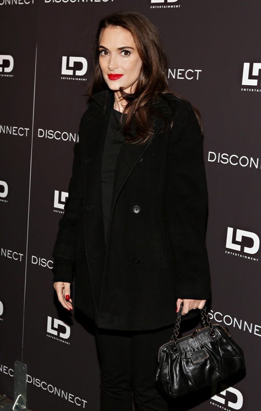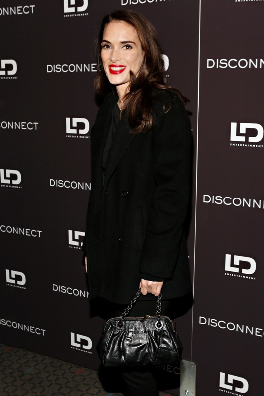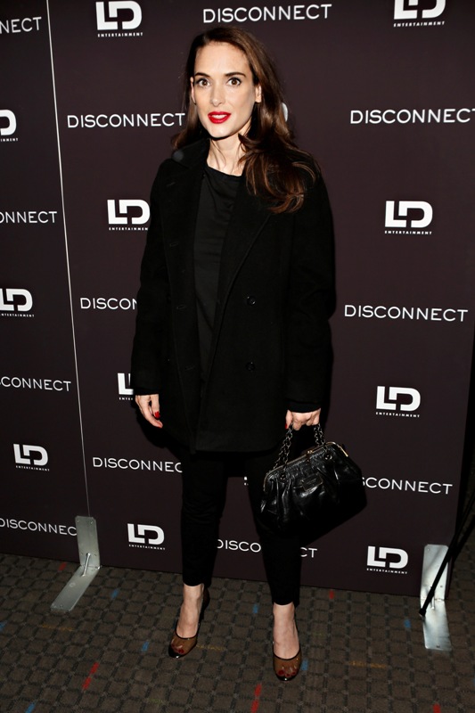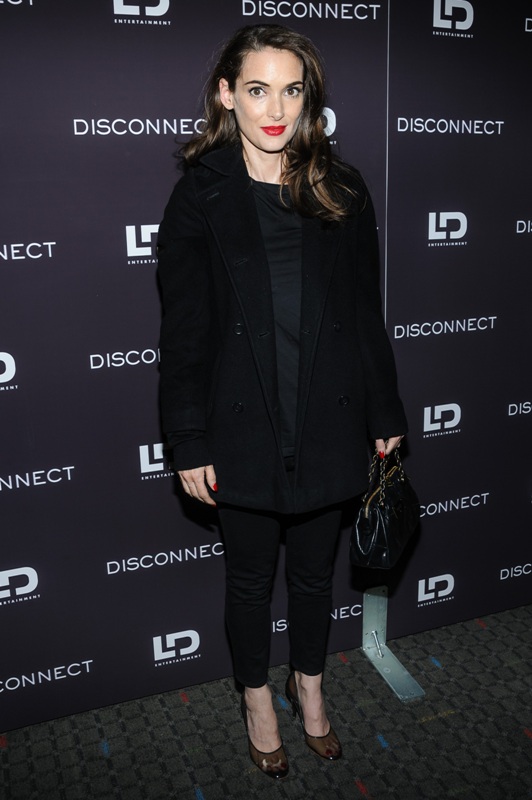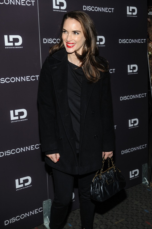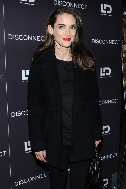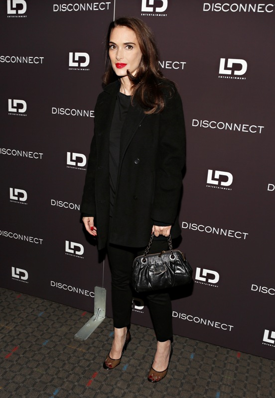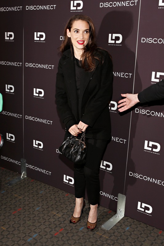 Here’s a very present Winona Ryder last night in New York for the premiere of Disconnect. God, those eyes. Those eyes. Are clear and wide and as beguiling as they’ve ever been. And, strangely, for some reason, she reminds me here, a little, of the Jolie. Angles, skin tone, lips, something?