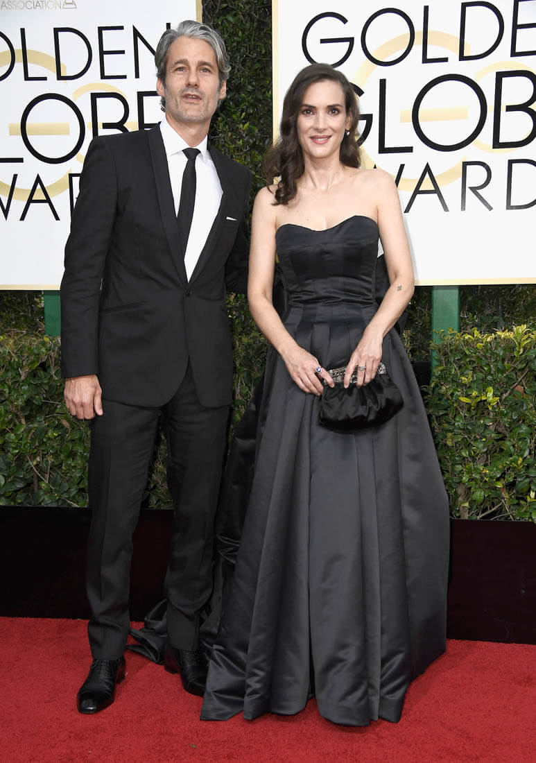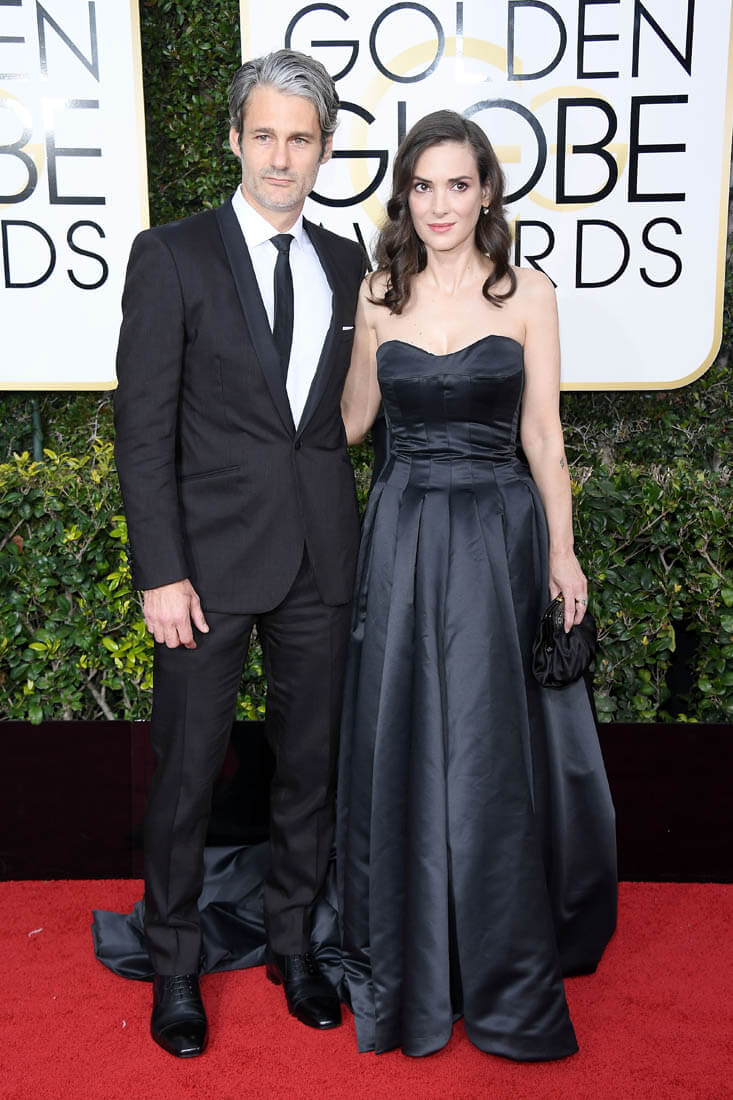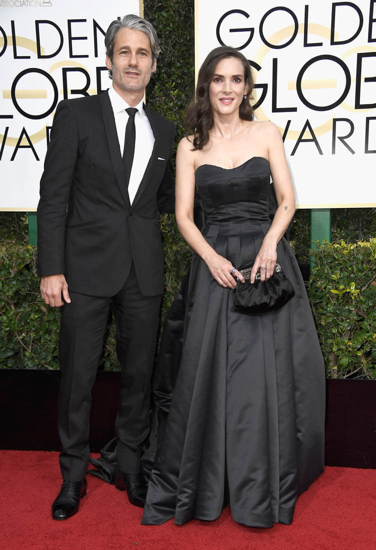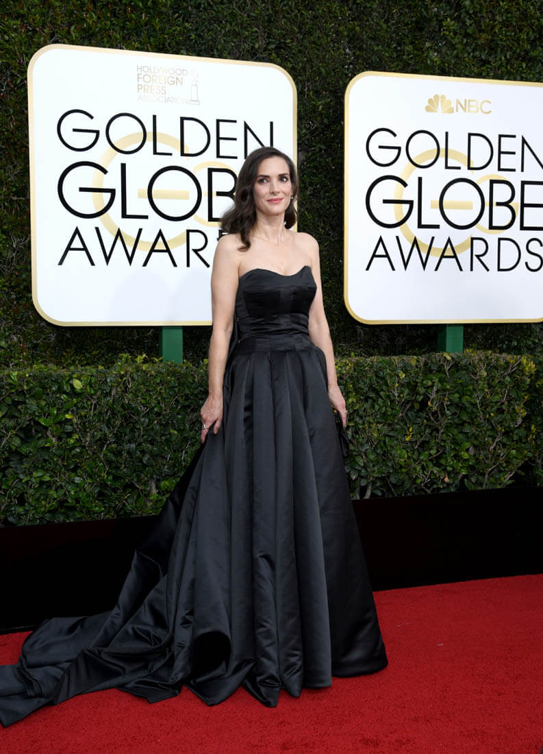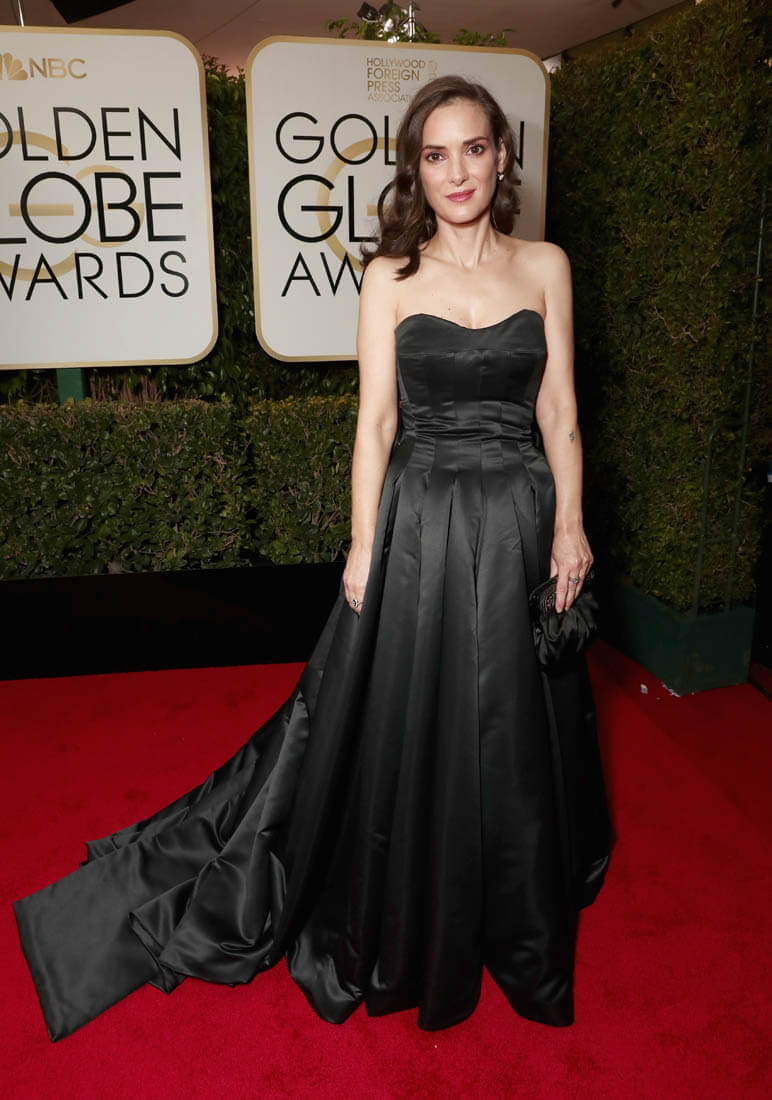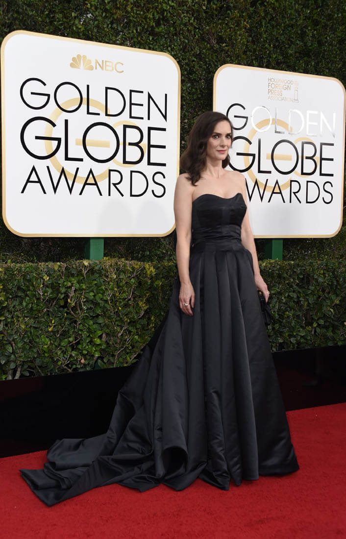 Winona Ryder’s dress for the Golden Globes was custom Viktor & Rolf. I’m surprised. I’m surprised she didn’t wear Marc Jacobs. I’m not surprised it’s black. I am also not surprised that it’s a nothing black dress, totally a whatever. Winona Ryder isn’t showing up at the Golden Globes anymore needing to be on the Best Dressed List. In fact, I think maybe she tried to actively avoid it. Which is why I don’t think we can hold this sagging, wrinkled, taffeta mess against her. F-ck taffeta though, OK? I am actually dying inside that my beloved Winona is wearing taffeta.