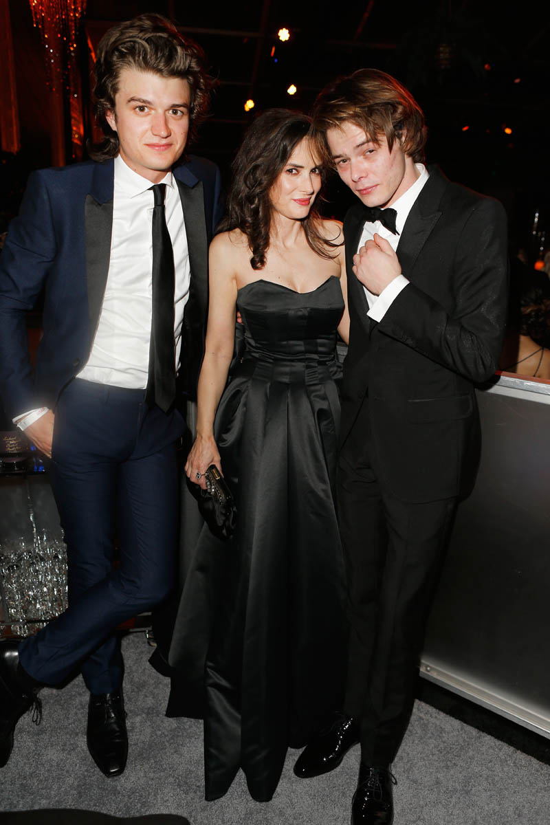 Winona was at the Globes with her boyfriend Scott Mackinlay Hahn who is giving me serious Eric Northman vibes. As usual, she’s awkward and uncomfortable on the red carpet. But look at these shots of her with Joe Keery and Charlie Heaton (Steve and Jonathan from Stranger Things) at the after-party. That smile. There she is, do you see her?