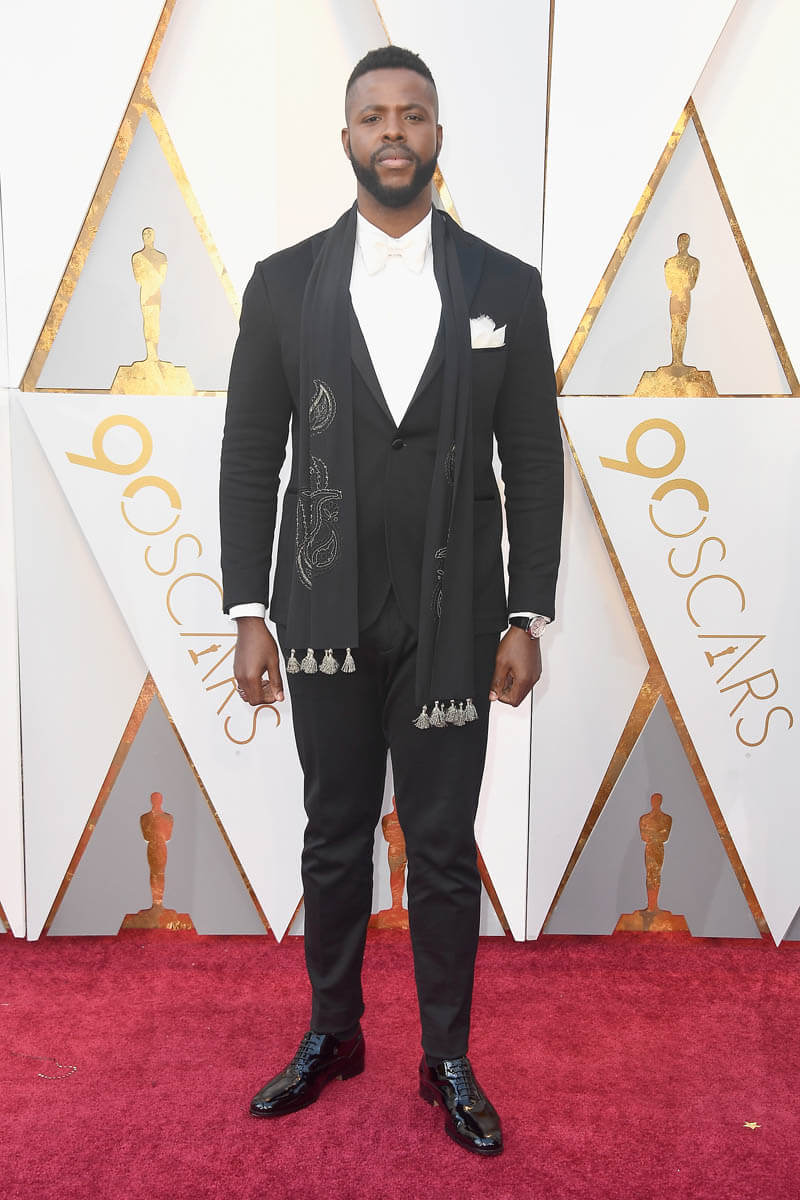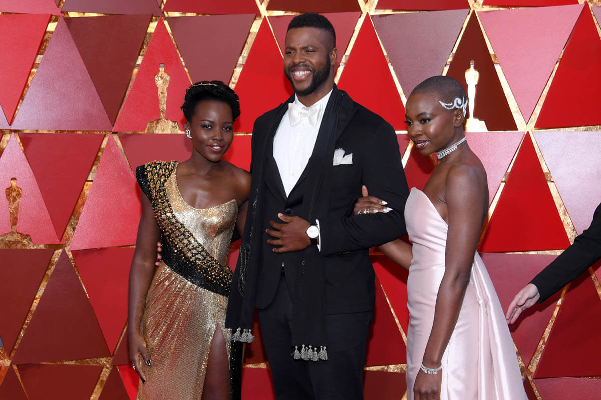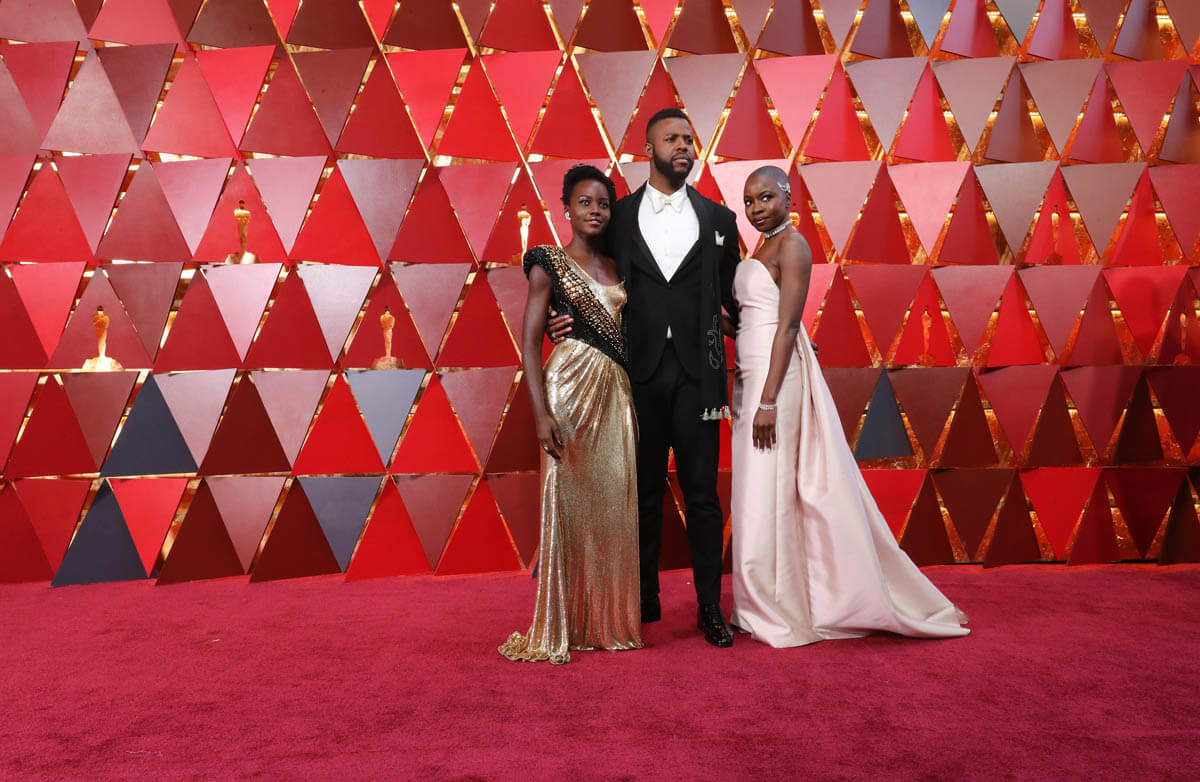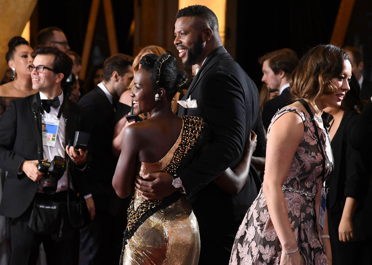 Six members of the Black Panther cast were at the Oscars last night. Daniel Kaluuya, the Best Actor nominee, Chadwick Boseman (Kathleen wrote about him earlier), Andy Serkis, Danai Gurira, Lupita Nyong’o, and Winston Duke, who we should not be sleeping on. That’s how much hotness there is in this movie, my GOD. We’ll get to Lupita’s dress later. It deserves its own post. For now, let’s focus on Lupita and Winston. Lupita, Danai, and Winston arrived together and worked the carpet together. They spent some time at the final photo wall, which is right underneath our etalk Oscar balcony, and at the slo-mo cam. Quick aside: the dude operating the slo-mo cam, which is a robotic arm, appeared to be trying to tell Lupita how to pose for it. On and on. I could see her, she was polite, but at a certain point, because we don’t have all night, she put her hand up and was like, boy, I got this.