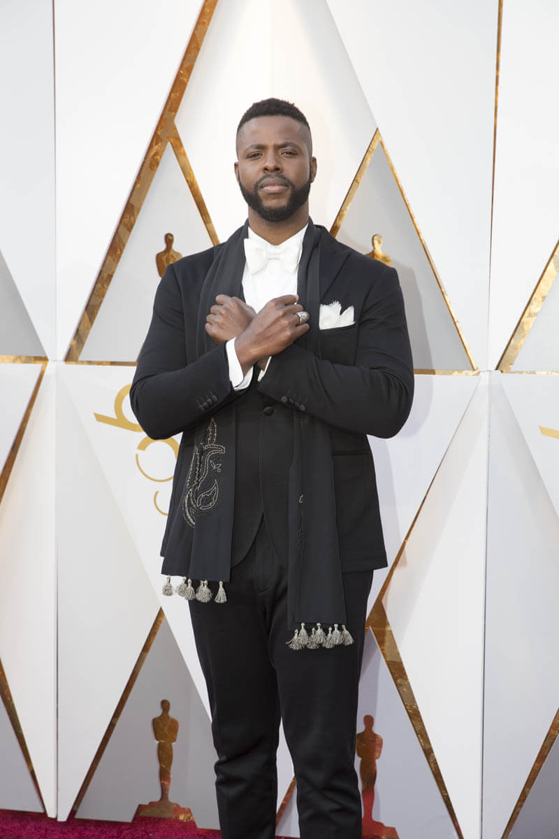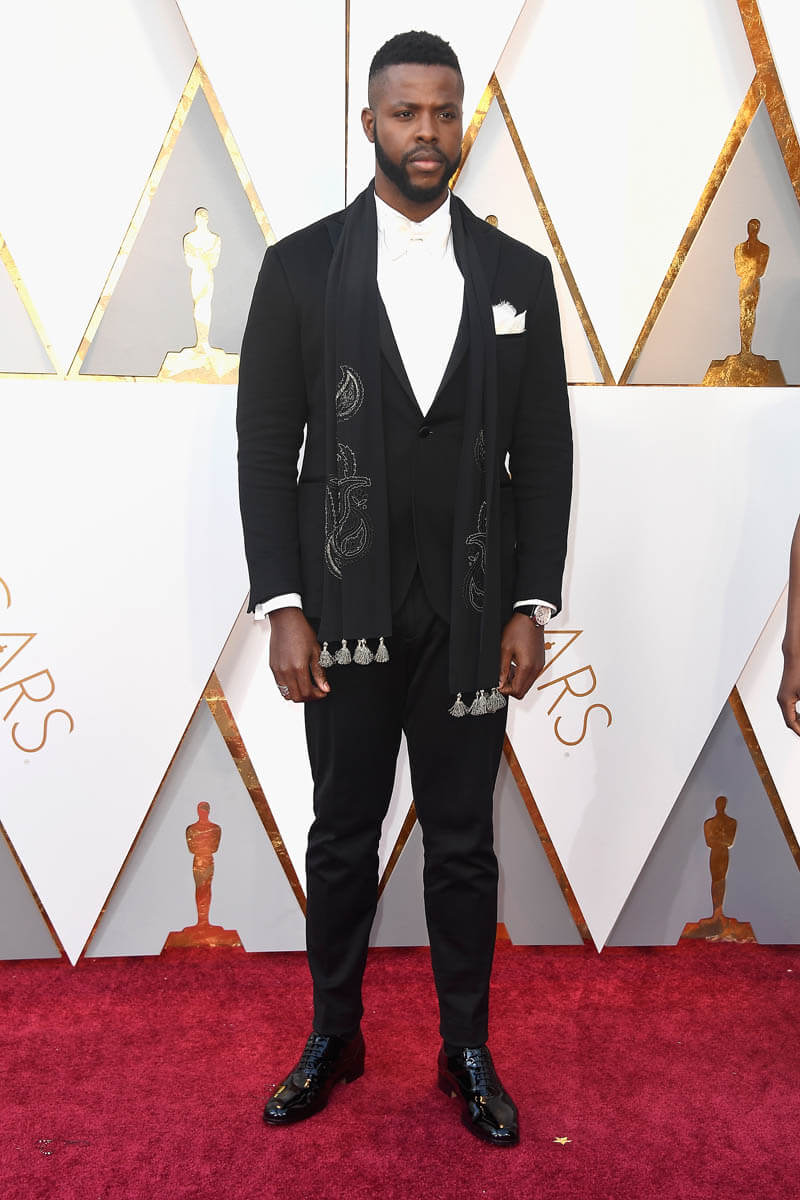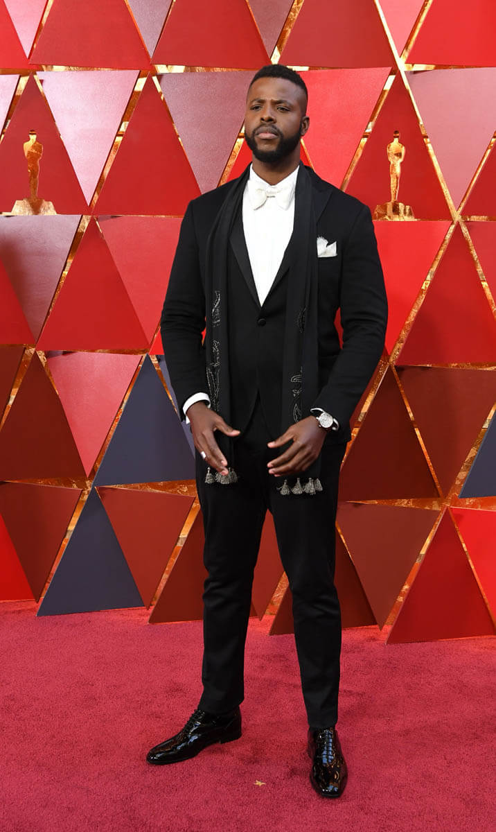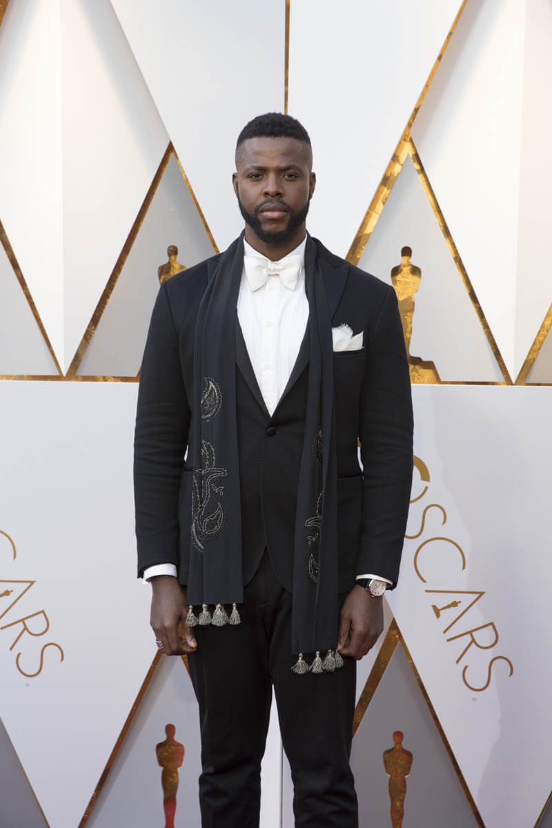 Six members of the Black Panther cast were at the Oscars last night. Daniel Kaluuya, the Best Actor nominee, Chadwick Boseman (Kathleen wrote about him earlier), Andy Serkis, Danai Gurira, Lupita Nyong’o, and Winston Duke, who we should not be sleeping on. That’s how much hotness there is in this movie, my GOD. We’ll get to Lupita’s dress later. It deserves its own post. For now, let’s focus on Lupita and Winston. Lupita, Danai, and Winston arrived together and worked the carpet together. They spent some time at the final photo wall, which is right underneath our etalk Oscar balcony, and at the slo-mo cam. Quick aside: the dude operating the slo-mo cam, which is a robotic arm, appeared to be trying to tell Lupita how to pose for it. On and on. I could see her, she was polite, but at a certain point, because we don’t have all night, she put her hand up and was like, boy, I got this.