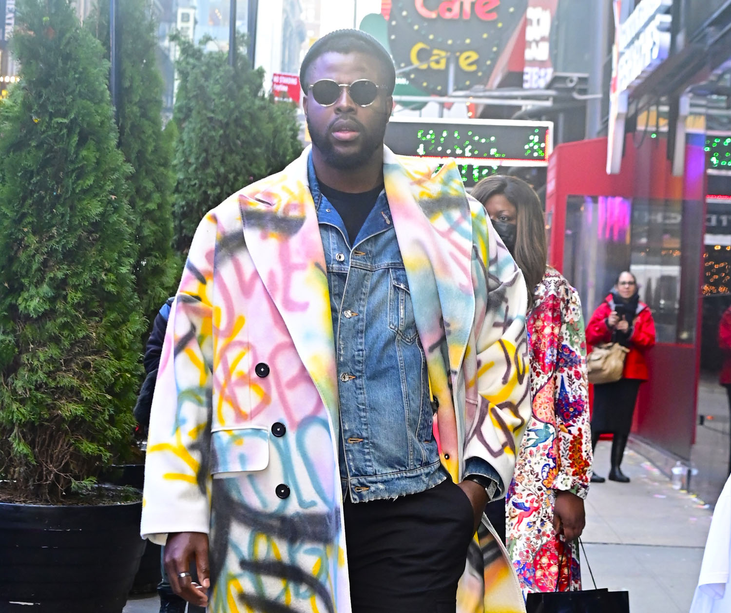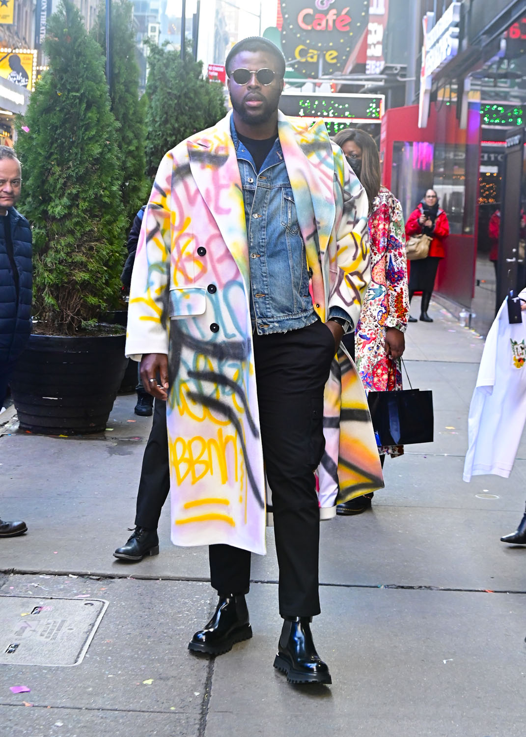 Winston Duke kicking off 2023 in a really great outfit. It’s a jacket on top of a jacket. That printed outer coat looks so good on him. But it’s made even better by the buttoned denim jacket underneath it. I love the decision to layer here. Partly for warmth, I suppose, but I would guess it’s mostly for style. Makes a difference, because if it had just been the black tee underneath I don’t think the fit hits in the same way. (Go Fug Yourself)