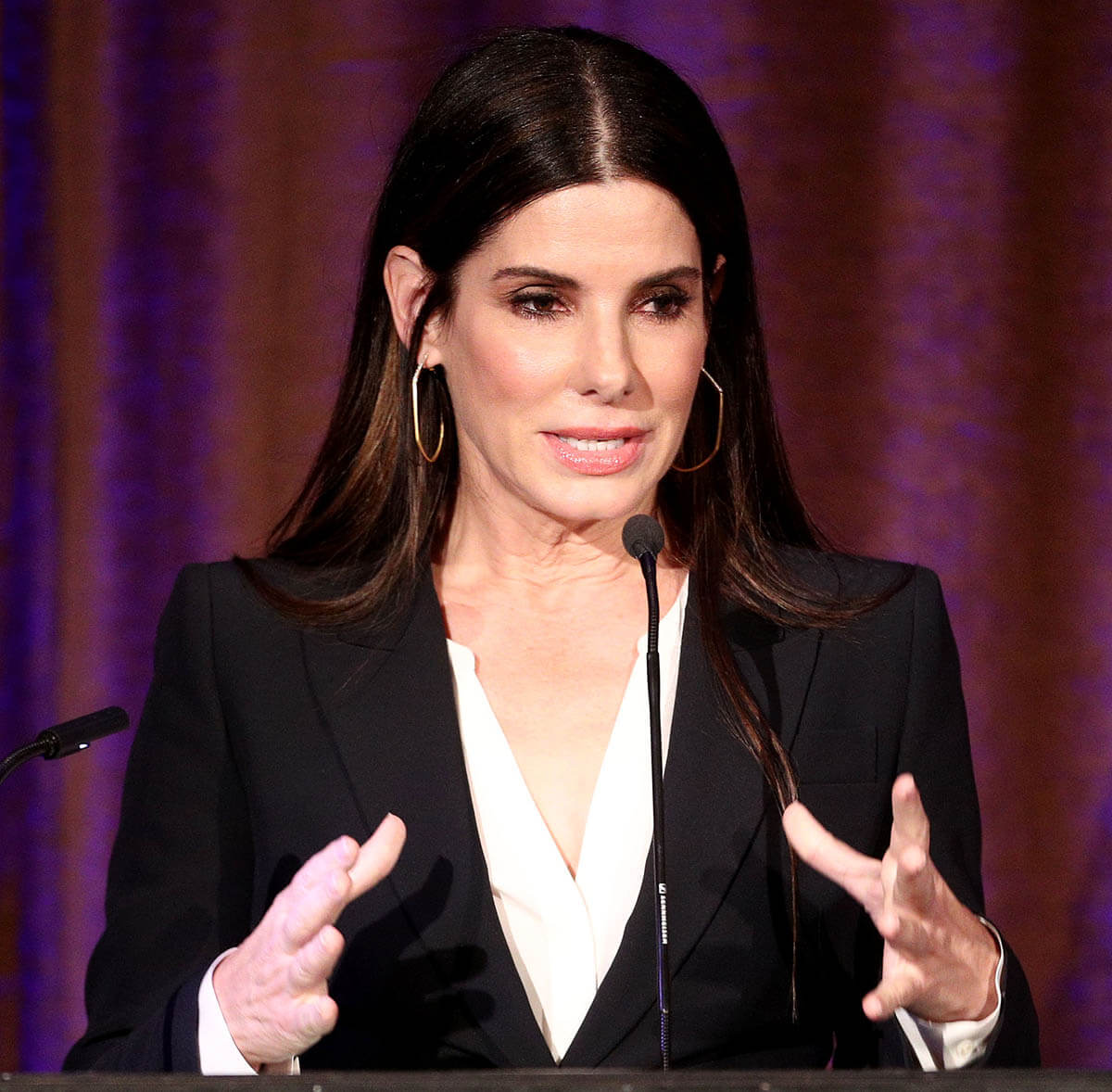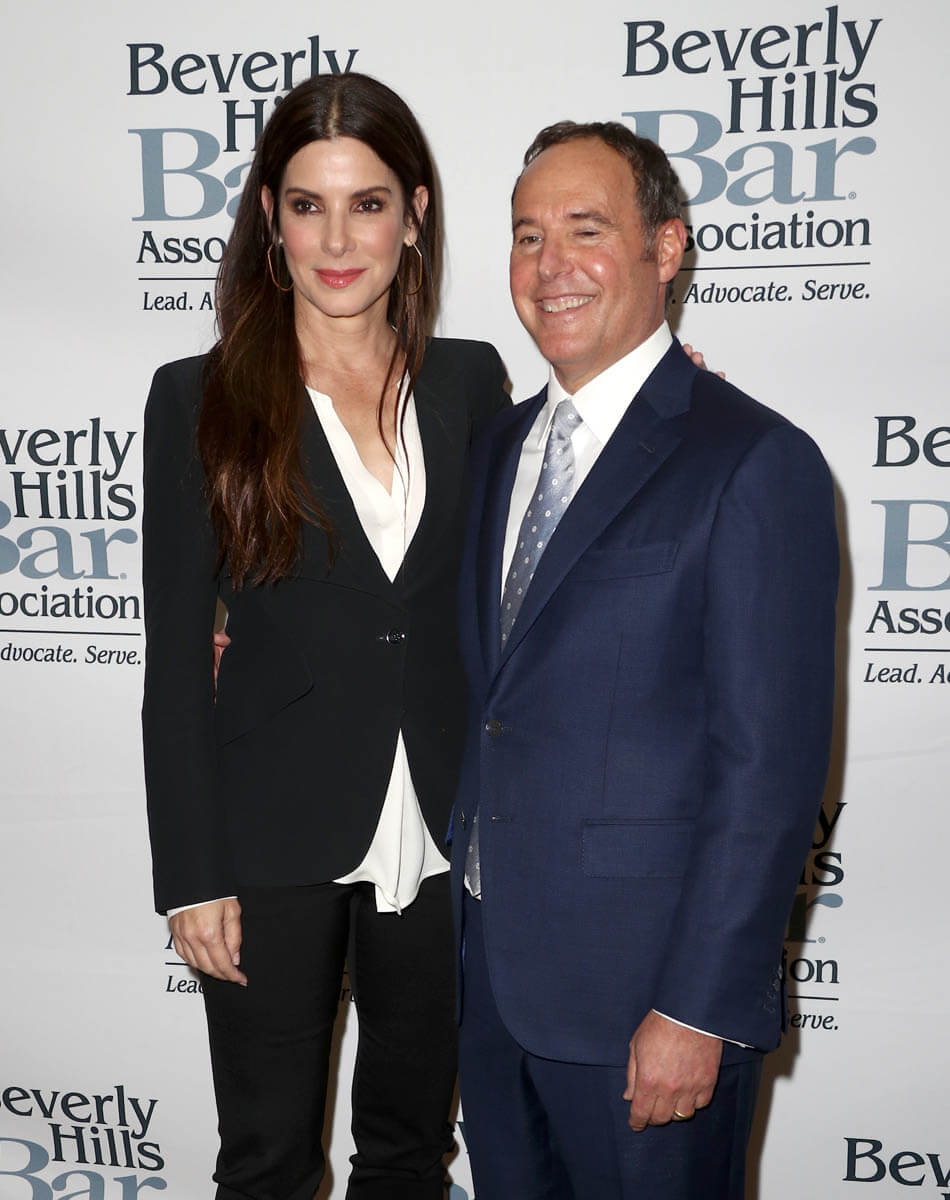Last night Sandy was in Beverly Hills at the Bar Association event honouring the Lawyer of the Year. This black suit though, it’s good, right? I mean it’s not terribly exciting. But that’s a great fit. The pants are a perfect fit. They stop at just the right point above her ankle. Also, I forgot to mention, I love the robe dress she wore at CinemaCon – here’s a refresher: