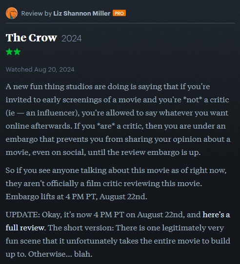 The relationship between studios and critics has always been fraught, but now it feels outright hostile. And I’m not complaining because ensh-ttifying Rotten Tomatoes hurts me financially. No one has ever found my work through RT, and it doesn’t drive traffic to this site. The only thing it does for me is make it easy to find all my reviews in one place. But I genuinely love film and film criticism, and it just sucks to feel like the people who make movies actively want to make your job, which already doesn’t support an independent living, that much harder. I’m just waiting for the day studios use AI to generate their own reviews to really tip the scales on Rotten Tomatoes. It’s the inevitable conclusion of all this.