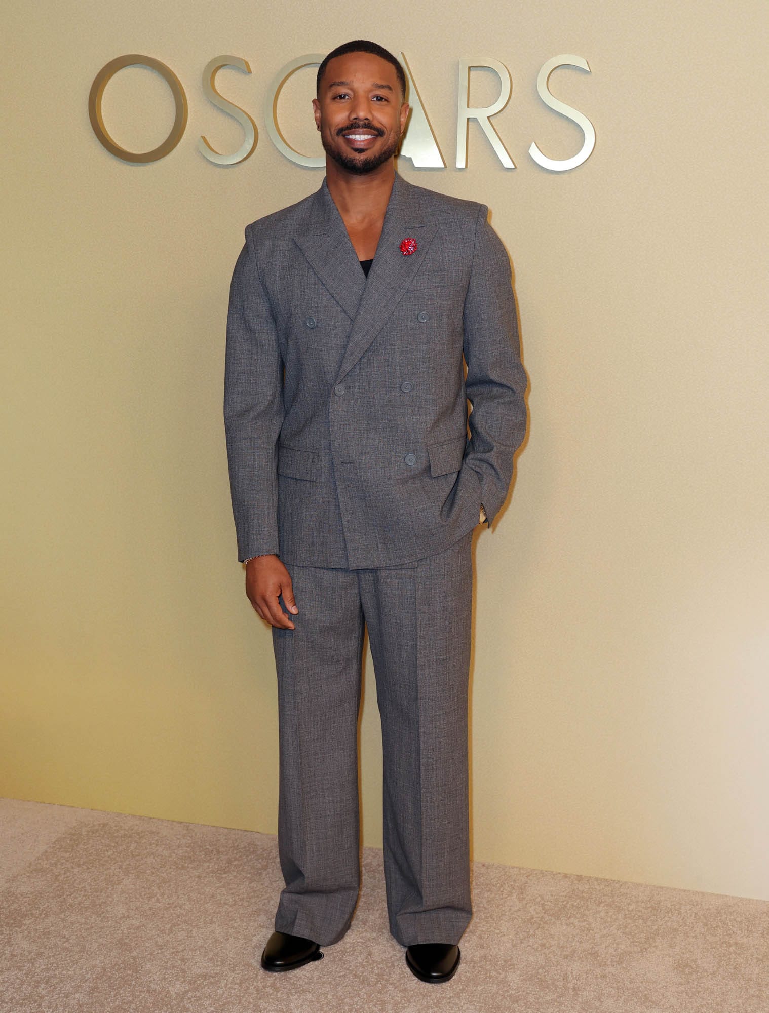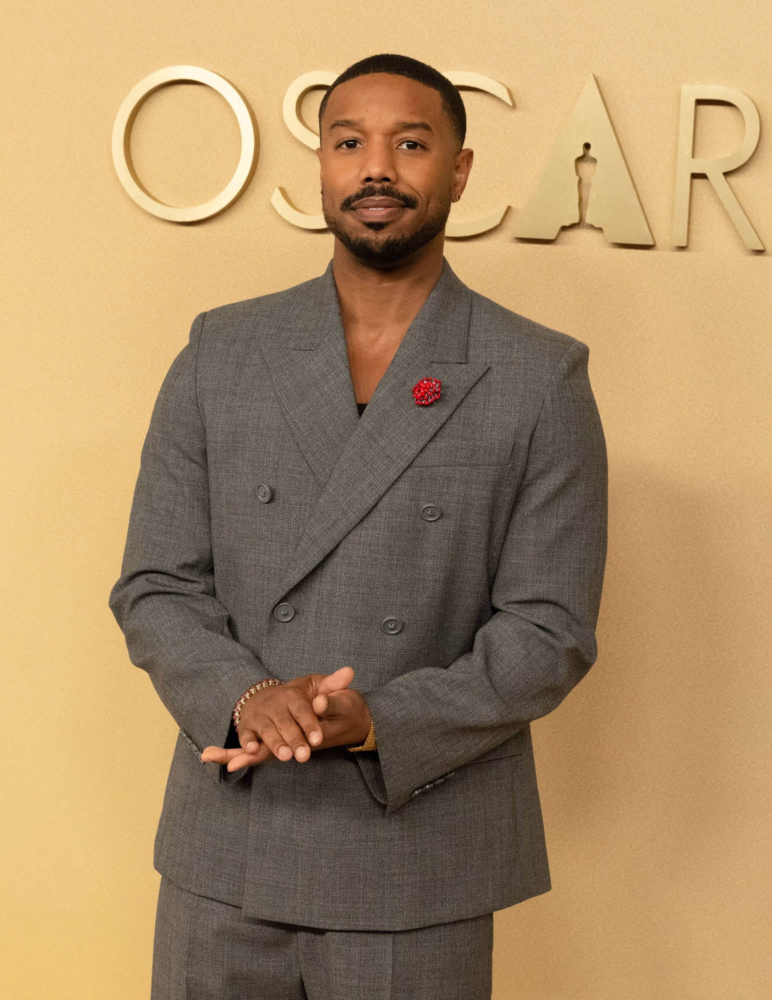 Still, MBJ is showing up alongside the Sinners team to celebrate the film’s record of 16 nominations and he was at the nominees luncheon yesterday looking fine as f-ck in grey, and a signature for him – no tie, tank underneath, plus that ridiculously gorgeous smile.