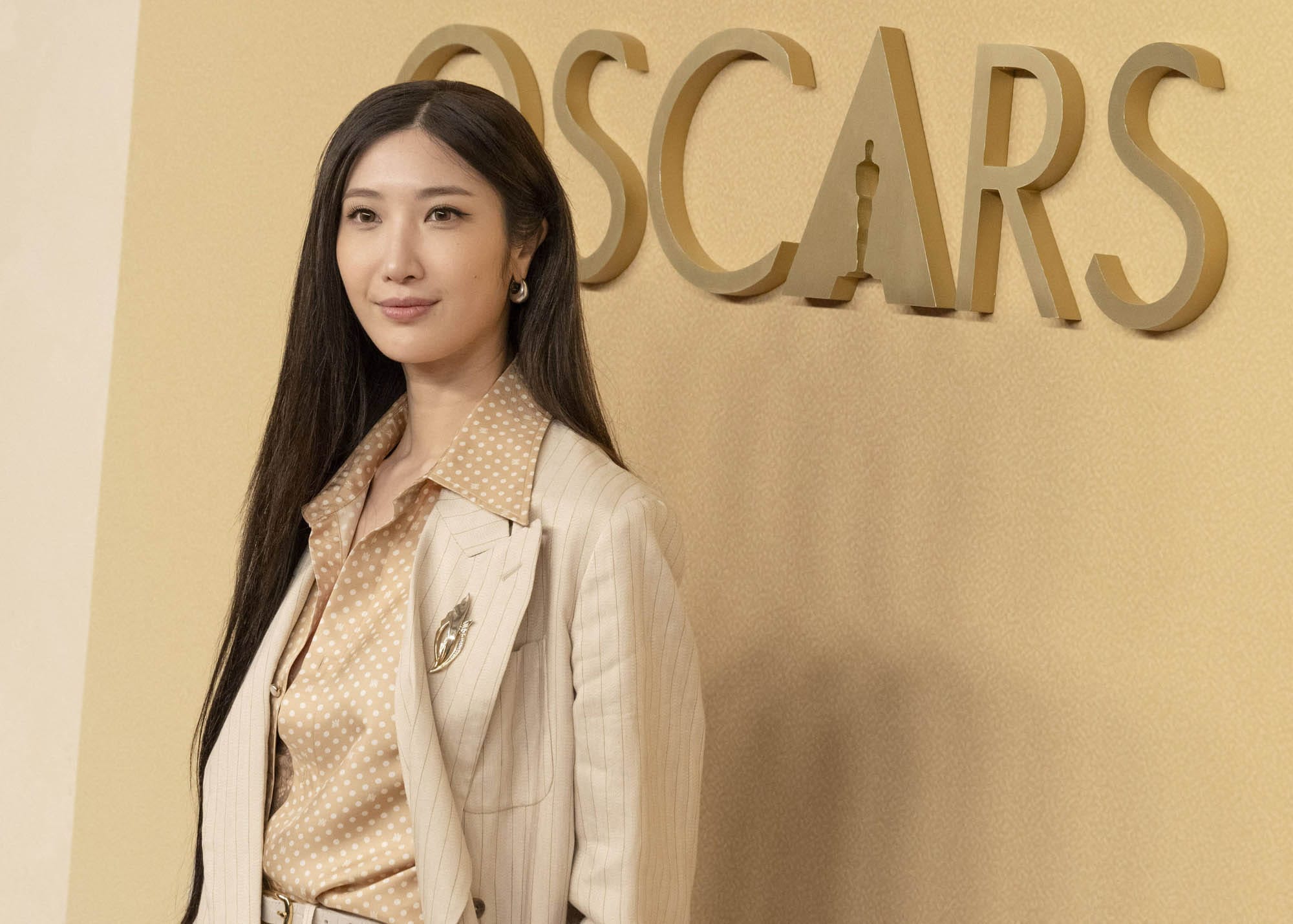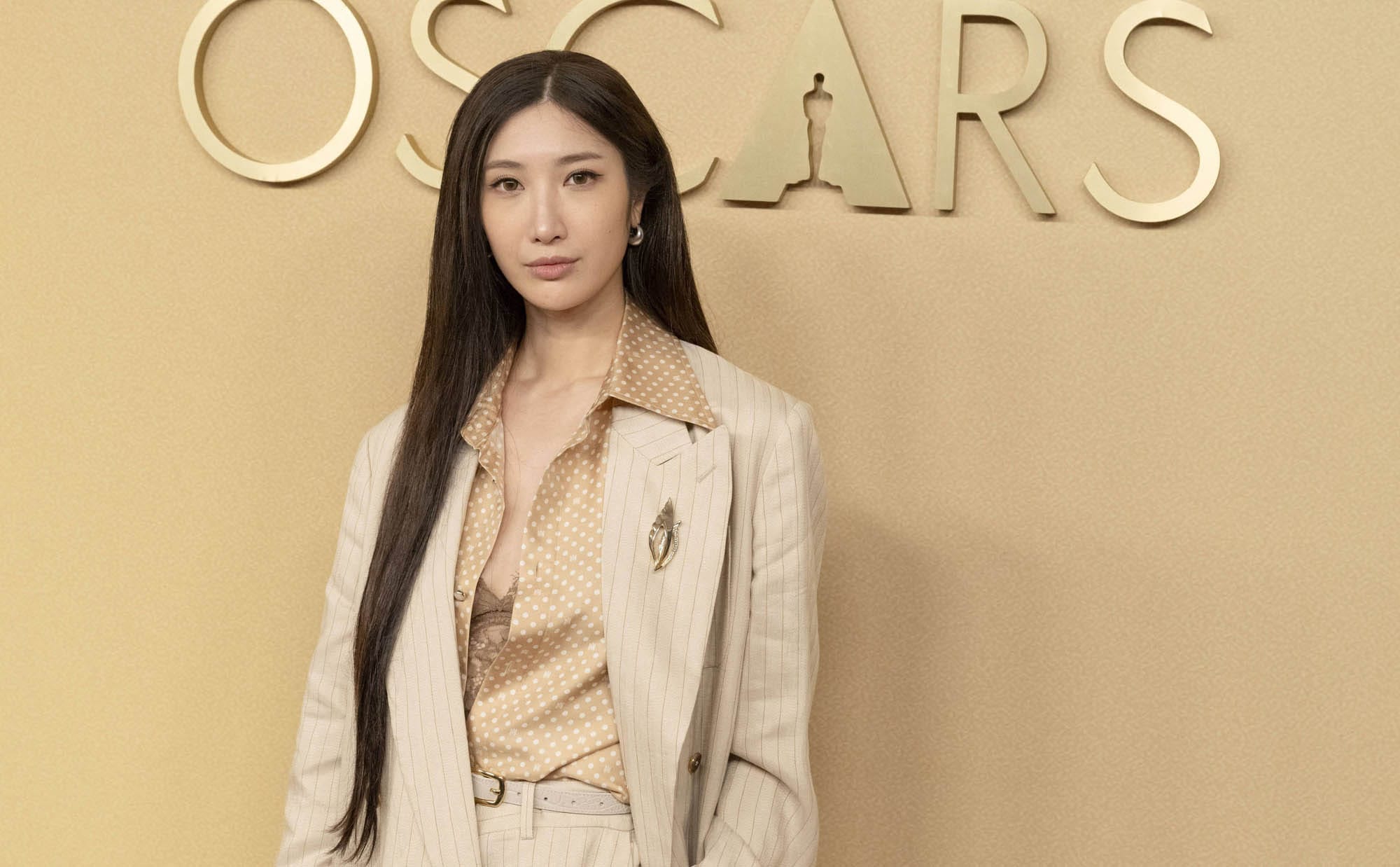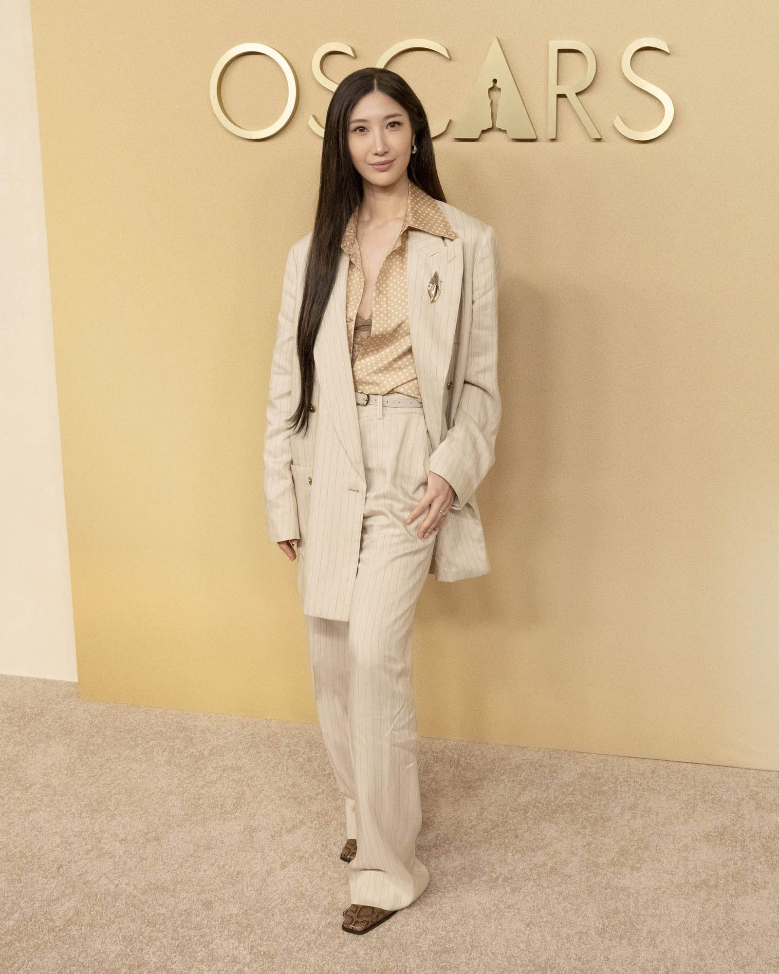 Like MBJ, EJAE is a first time Oscar nominee for “Golden” in the best original song category. She was in a perfect look for the luncheon – cream striped suit with a silk shirt. And the look was noticed by MBJ who stood next to her for the class photo which is when this happened: