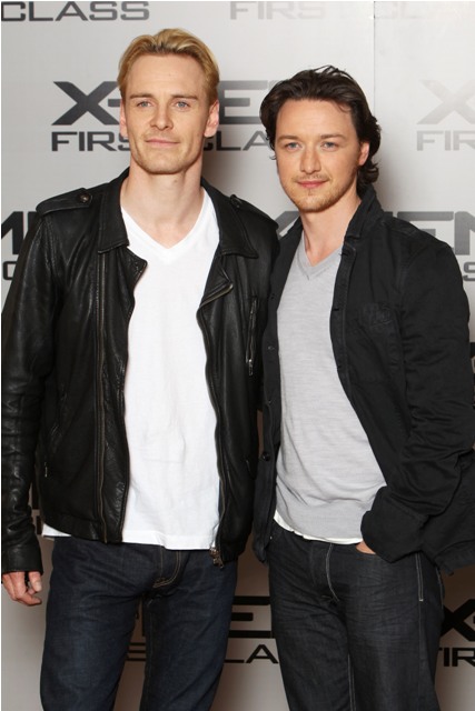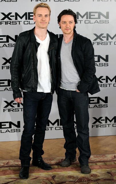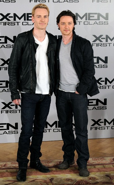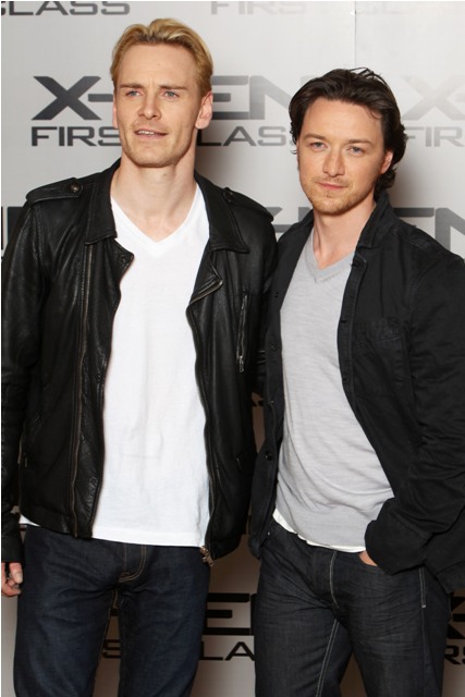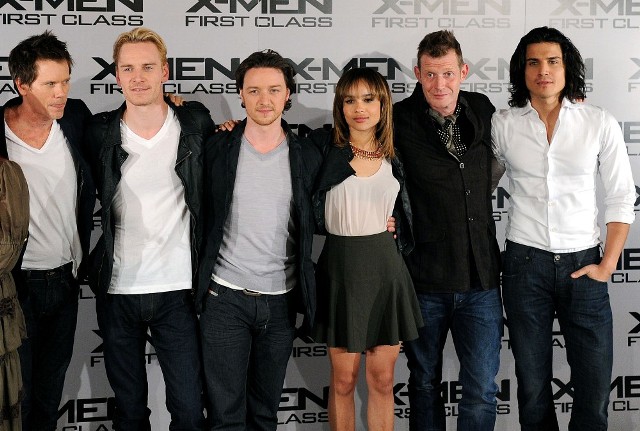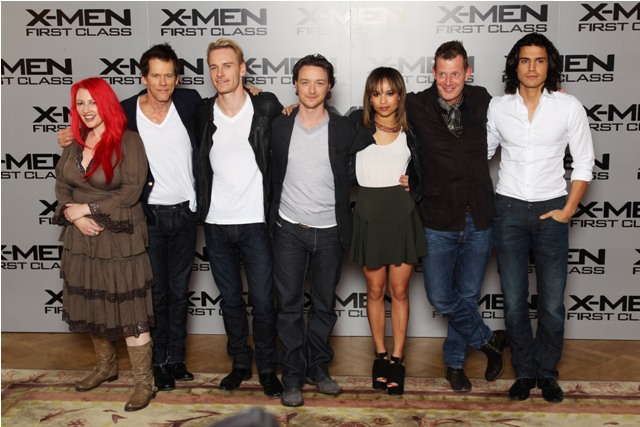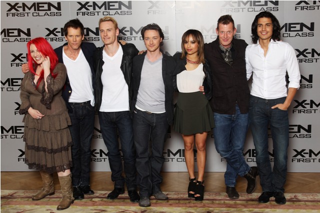 Yesterday, several members of the cast, without Jennifer Lawrence who’s been doing promotion in the US to stay close to filming for The Hunger Games, were in London for a photo call to promote the movie including McAvoy, Michael Fassbender and his girlfriend Zoe Kravitz, Kevin Bacon, Jason Flemyng, Alex Gonzalez, and Jane Goldman, a frequent Matthew Vaughn collaborator (ie Kick-Ass), who wrote the screenplay. I suppose we should not have doubted that combination. By the way, Vaughn is married to Claudia Schiffer which… imagine the whole lot of them, with Jonathan Ross (Goldman’s partner), all out to dinner? Random.