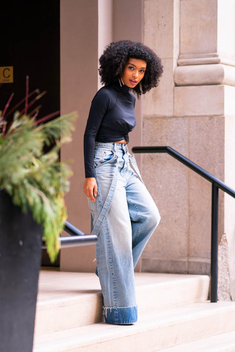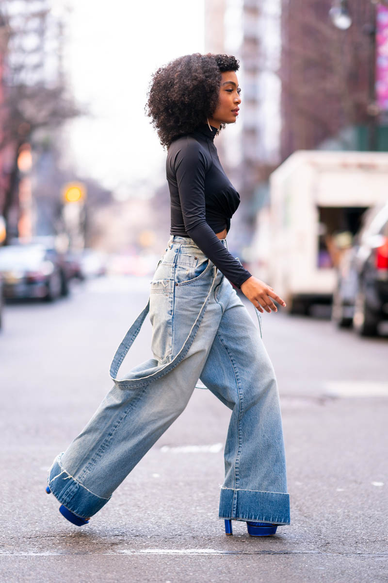 Let’s start with the jeans – wide leg, suspenders dropped to the side, with a black turtleneck, crop-tied, big hair, and super short curly bangs. These bangs. I’m obsessed with these bangs on her. This look is a high degree of difficulty. Actually, all of these looks are a high degree of difficulty. I’m not saying this is at all “relatable”. But, at the same time, this is also what we want – when someone has the potential to be this stylistically exciting, we want them to go there, and she does.