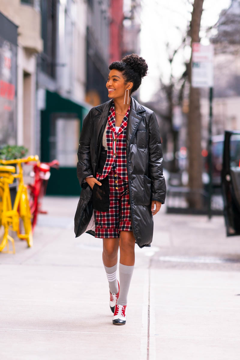 And underneath that blazer puffer, a plaid shorts suit. Like tailored pyjamas. With mid-calf socks, and heeled multi-coloured oxfords, OMGGGGGGGGGGG.