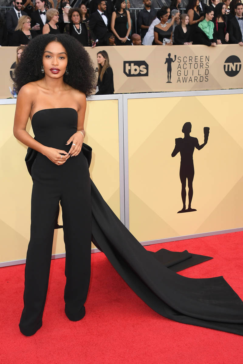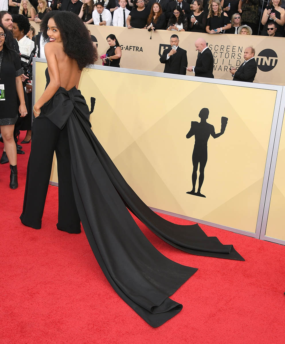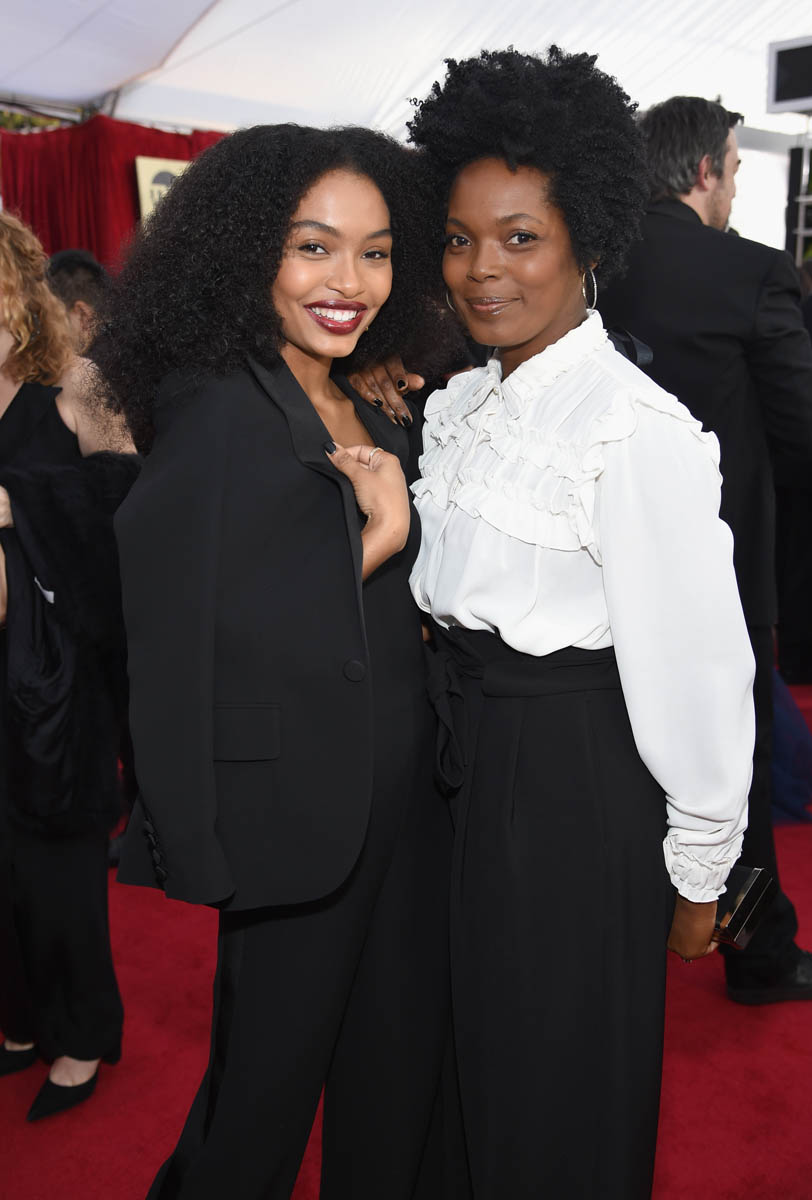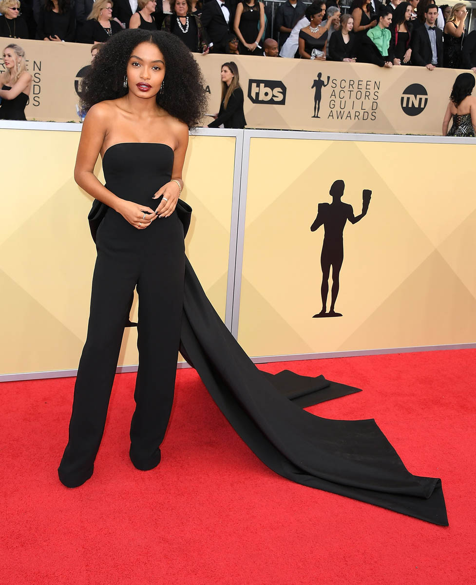 Last week it was confirmed that grown-ish has already been renewed for a second season. Yara Shahidi celebrated that news by wearing the sh-t out of this black jumpsuit last night at the SAGs. Every decision about this look was the right one. The hair is drama and eliminates the need for extra accessories. That shade of red on her lips, with brown undertones, I can’t make it work but my GOD, it was made for her. And OMGGGGGG she’s coordinating with her mom, Keri. Look at her mom!