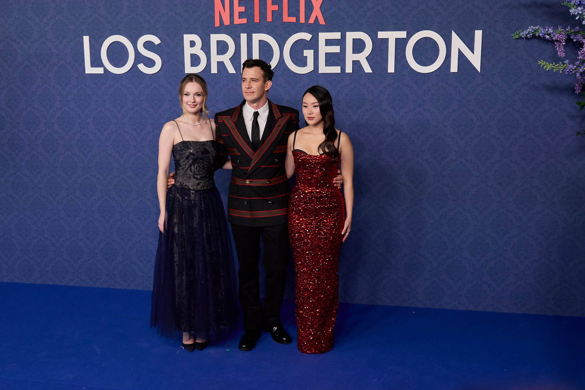 Luke Thompson, Yerin Ha, and Hannah Dodd attend the "Bridgerton" Season 4 Madrid Masquerade Ball at Casino de Madrid on February 17, 2026 in Madrid, Spain
