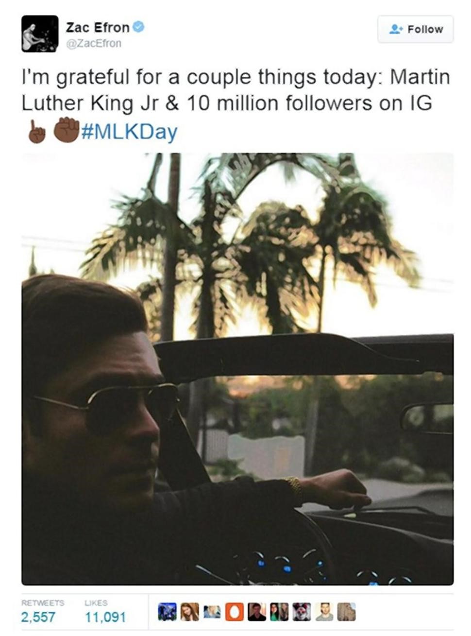 I opened yesterday’s blog with Zac Efron. Zac decided to celebrate Martin Luther King Day by connecting the holiday to having amassed 10 million followers. And he threw in some emoji blackface just for sh-ts and giggles. Zac has since removed the post. But the internet is forever. So here, why don’t we all enjoy his dumbassness again: