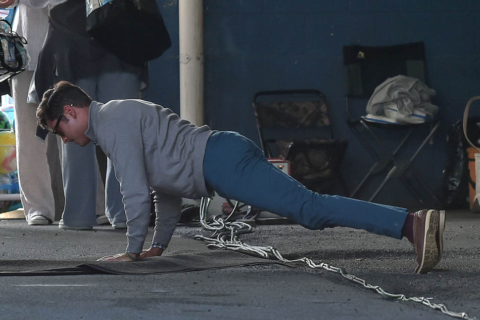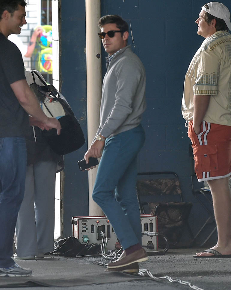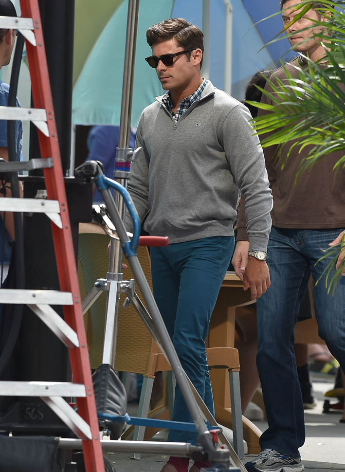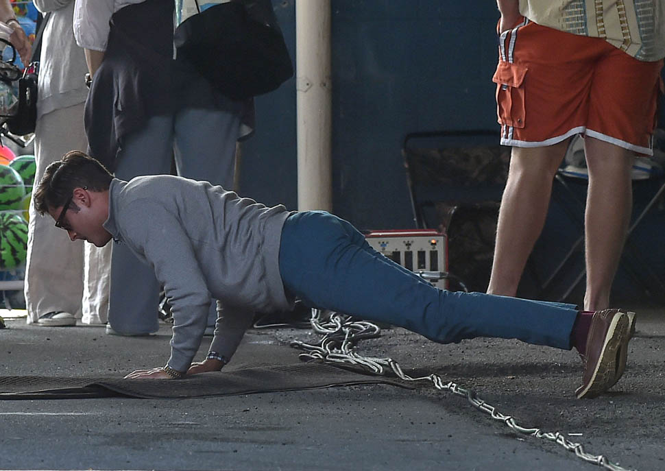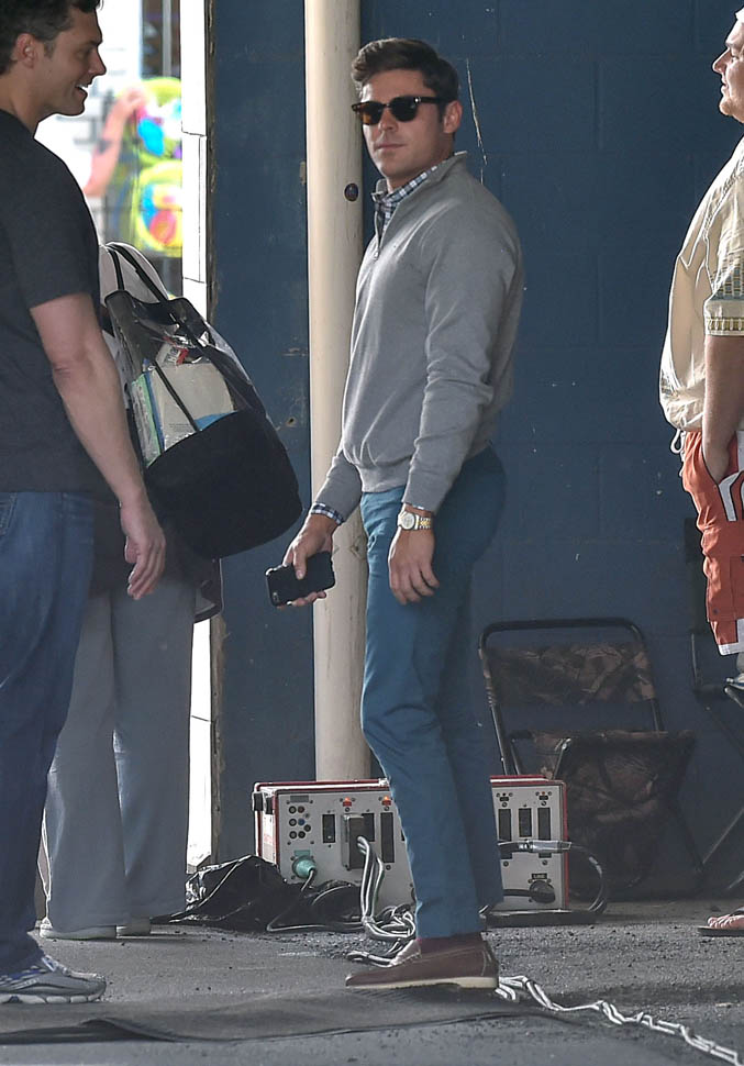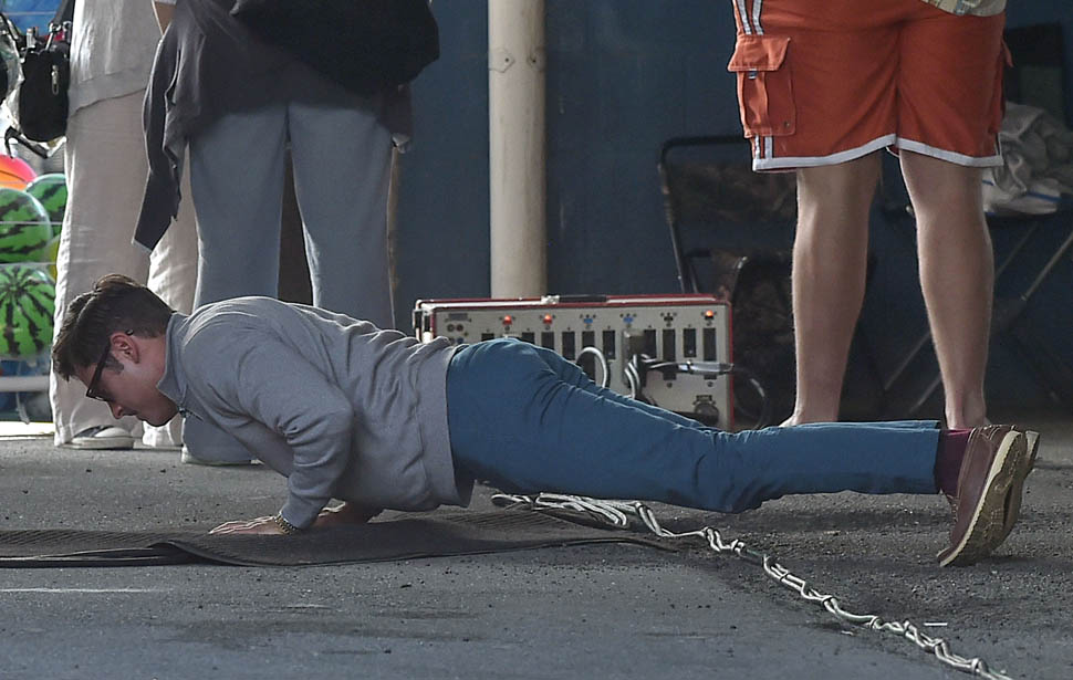 Zac Efron is in Georgia working on a movie called Dirty Grandpa. He was photographed on set today. In between scenes, he appears to be dropping down for a set of push-ups. I mean, good for him, you know? Maximise every minute. It can be boring, sitting around in your trailer all day, waiting for them to set up the lights and block the shots. If he’s using his time to stay healthy, stay fit, you’d have to be a major c-nt to bitch about that. And I don’t necessarily want to bitch about it. I just want to ask you if you’ve been there. If you know someone who, for no apparent reason, like you’re all just standing around, hanging out, and suddenly s/he’s on the ground doing push-ups or squats and it takes everything you’ve got to suppress the side-eye you want to share with your best friend…