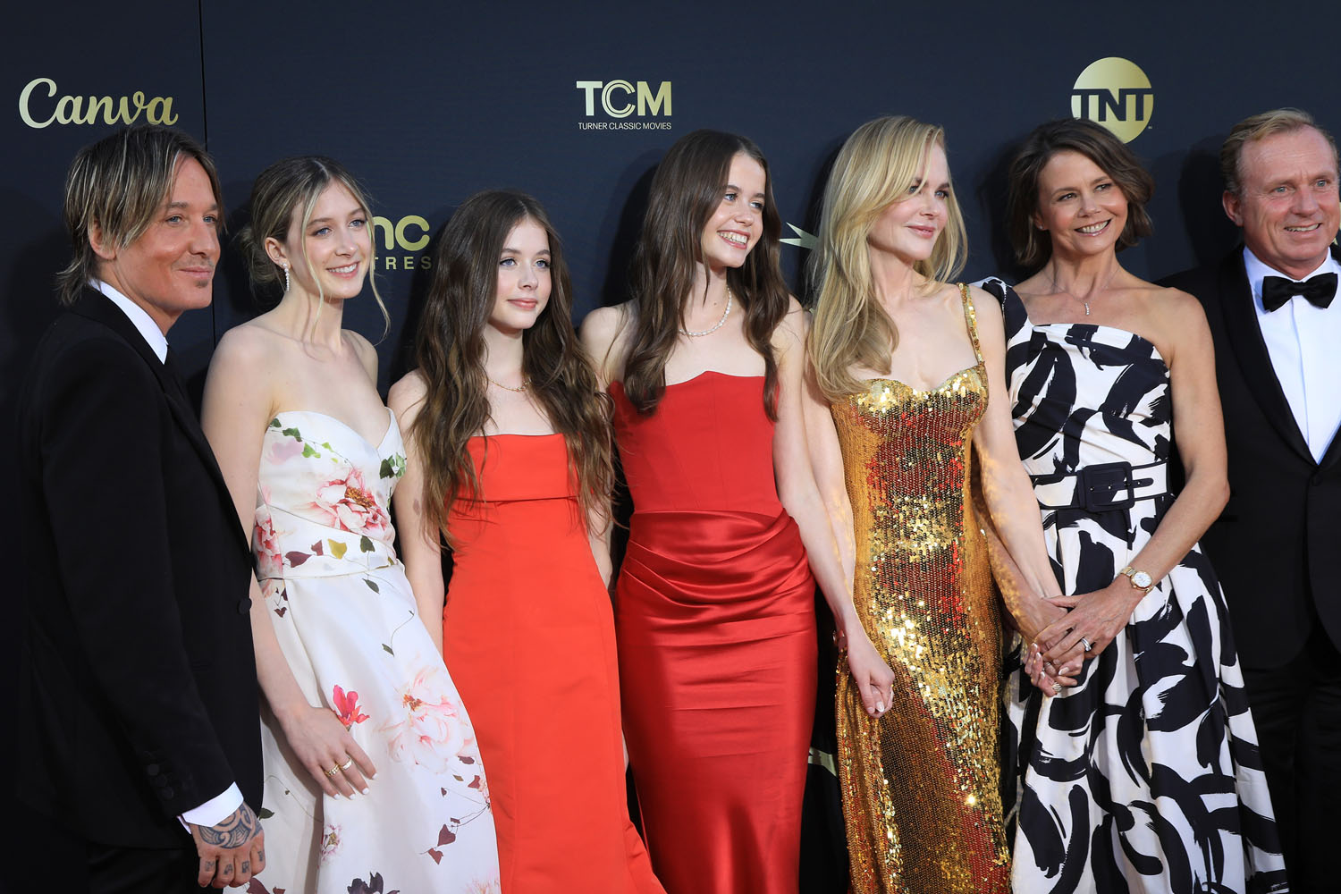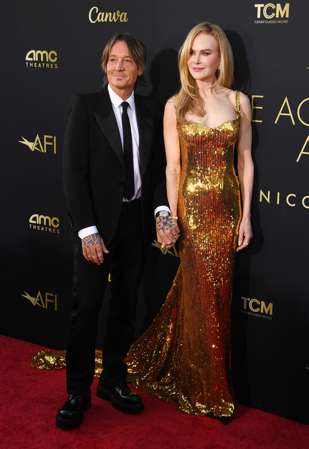 Let’s get back to Nicole at the AFI gala last night. Keith Urban, their two daughters, and her niece were with her, and that’s one of the major headlines since we don’t see their kids all that often. But my major headline is this look. Because holy sh-t she is wearing the sh-t out of this gold dress and it’s the perfect choice on a night where Hollywood’s royalty has gathered to toast her.