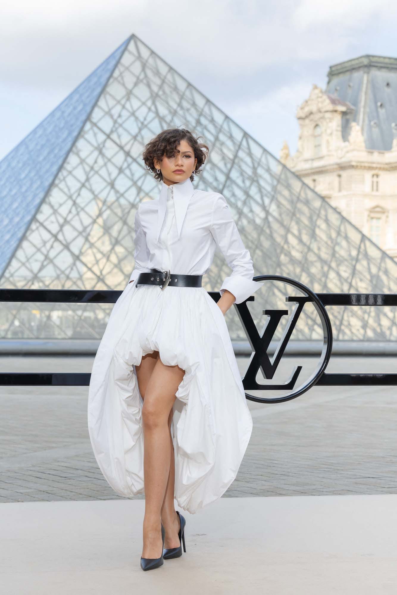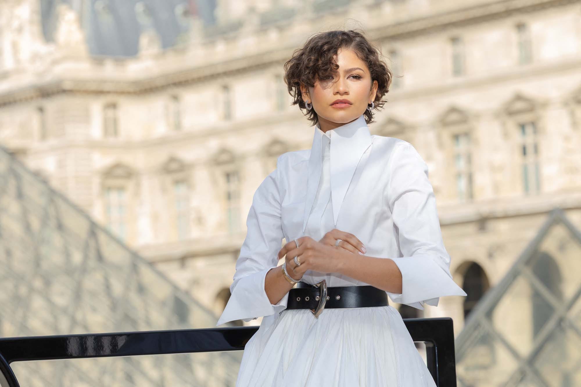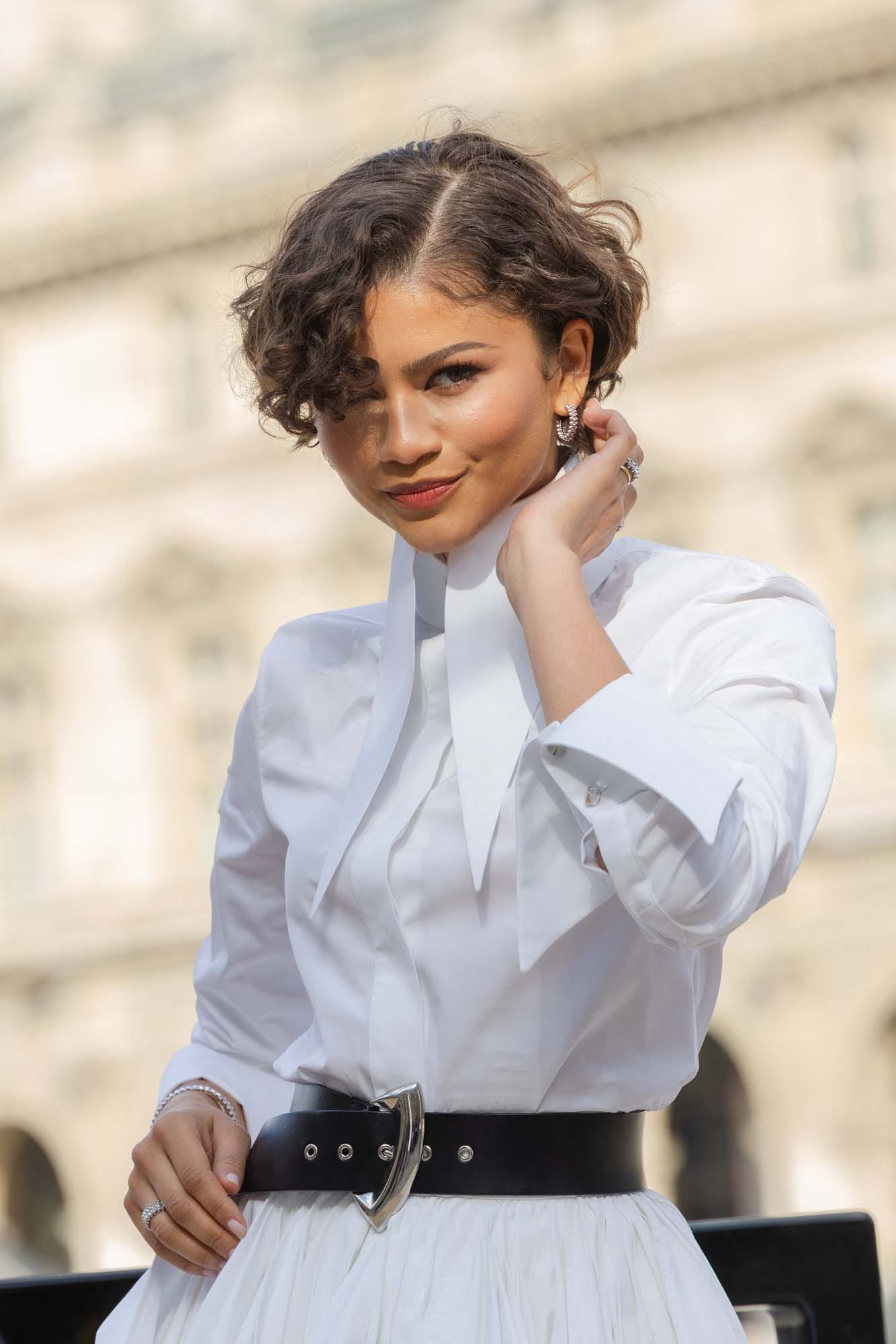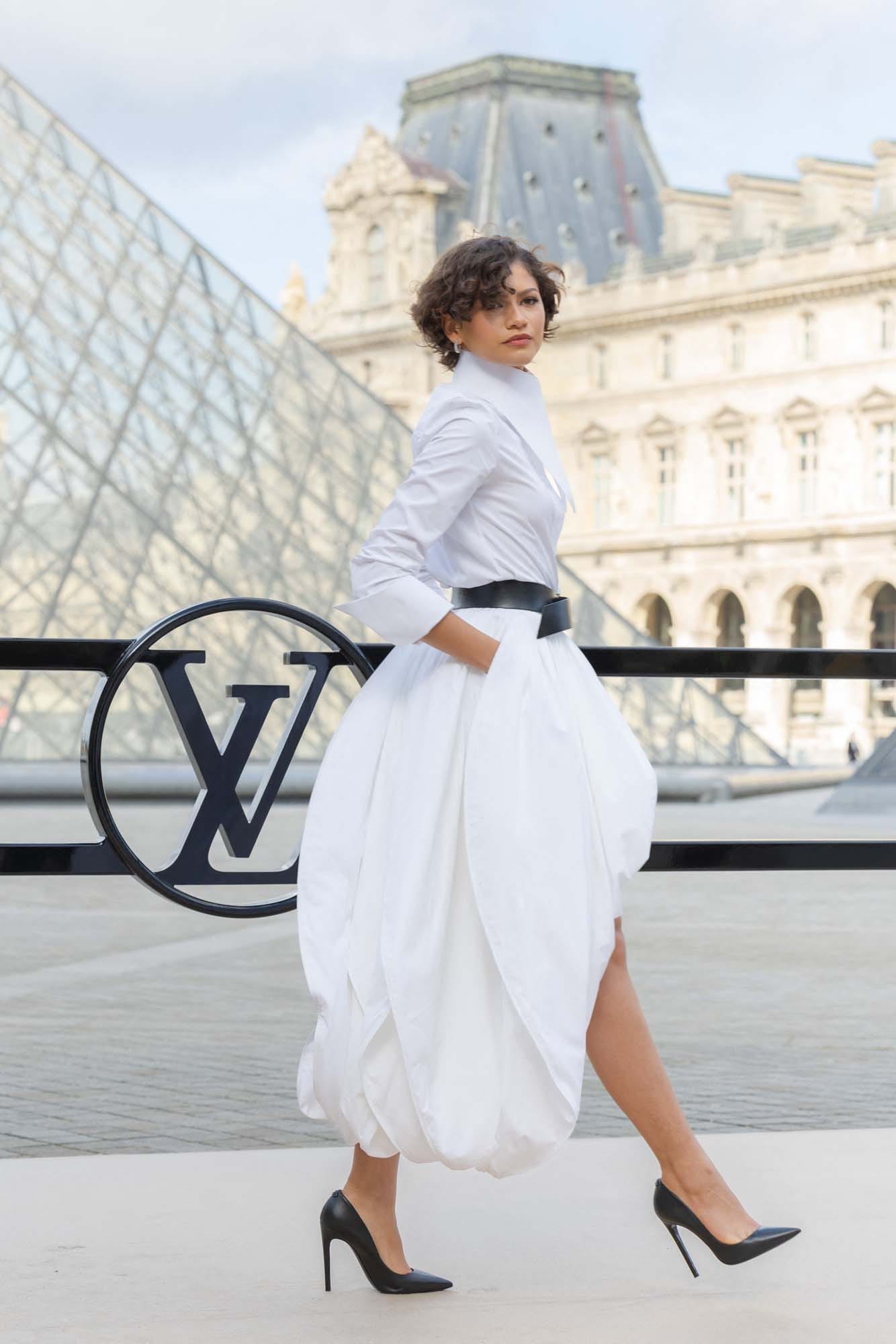 And if we needed more confirmation, she’s made it clear today in Paris, in her role as Louis Vuitton ambassador, Zendaya posed in a glorious white shirt dress, belted, mulleted, and bubbled, that she and Tom are, indeed, married.