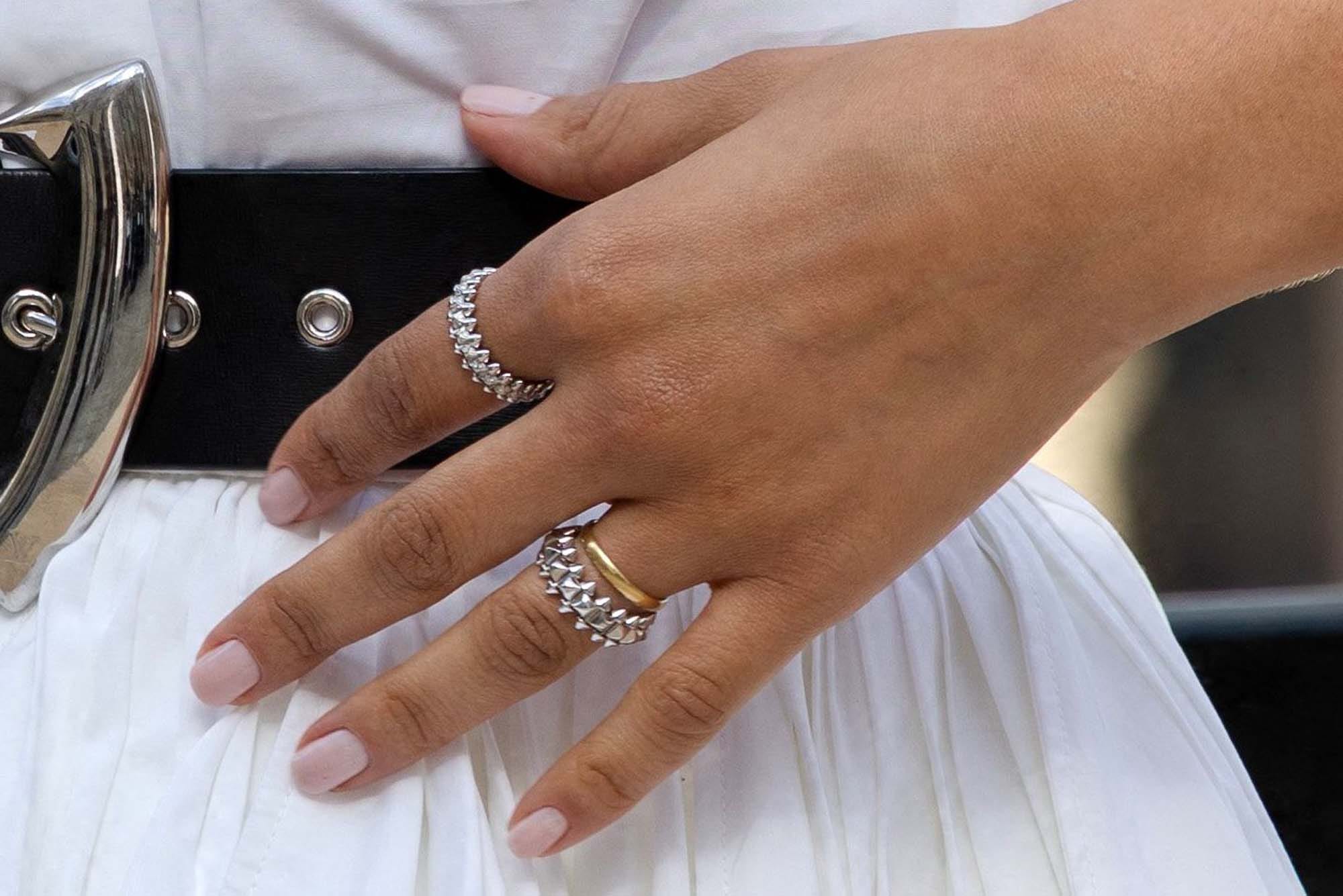 Doesn’t take a stylist to tell you that that gold band does not belong with that silver ring. And she could have, if she wanted to, slipped off her wedding ring and chosen to go with the most stylish option, considering she must be aware of all the speculation. The fact that she didn’t, and the rings are such a glaring style clash, makes it that much more obvious.