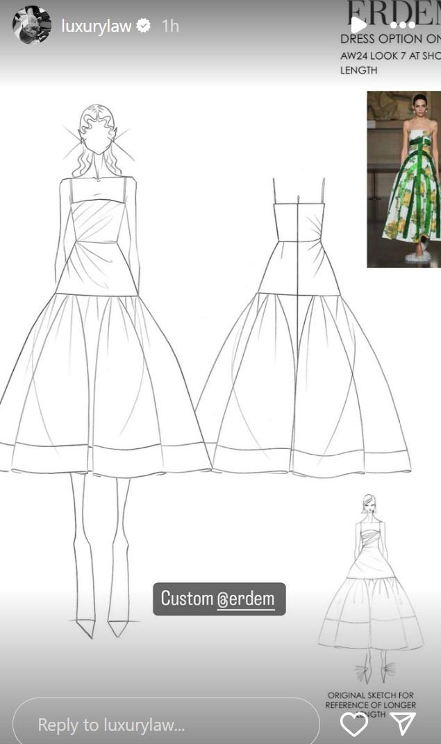Right? SO PRETTY. For the season and also for Challengers. But not too Challengers. It’s the perfect choice for morning television. This is exactly the kind of dress viewers want to wake up to. But there’s another reason I want to talk about the look and it’s because Law Roach shared something about the design. The dress is custom Erdem and on IG stories he posted the original sketch and the runway photo … which… if it was on the runway, why was it custom?