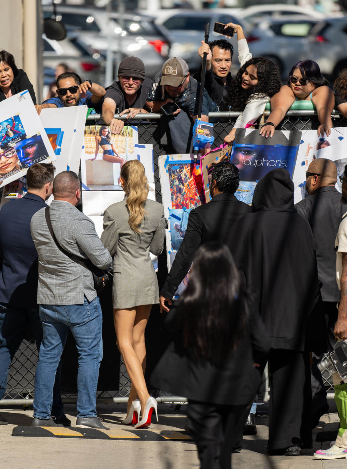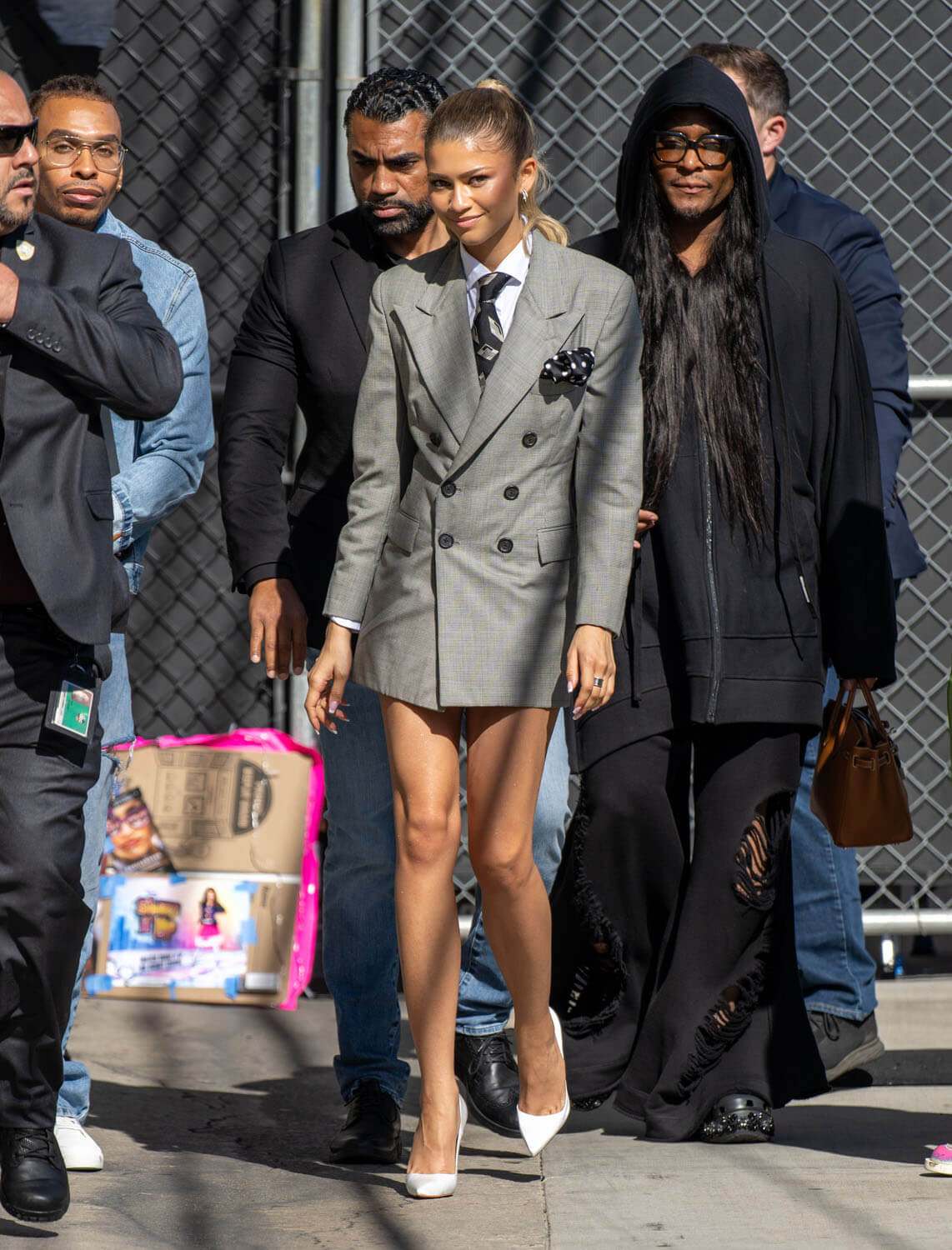 Zendaya continues living her best outside life, appearing on Jimmy Kimmel Live! last night in a mini suit dress with killer white pumps.