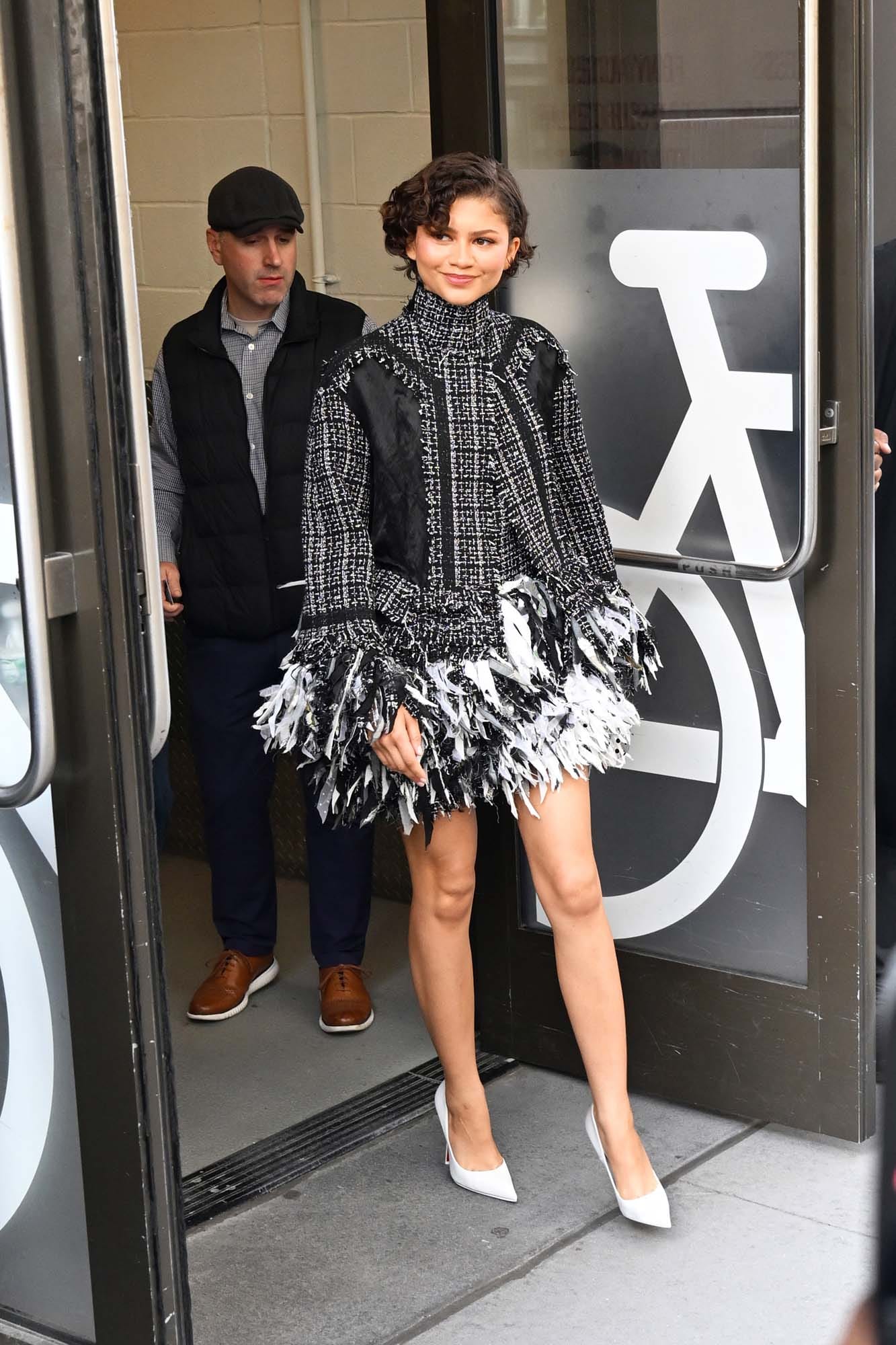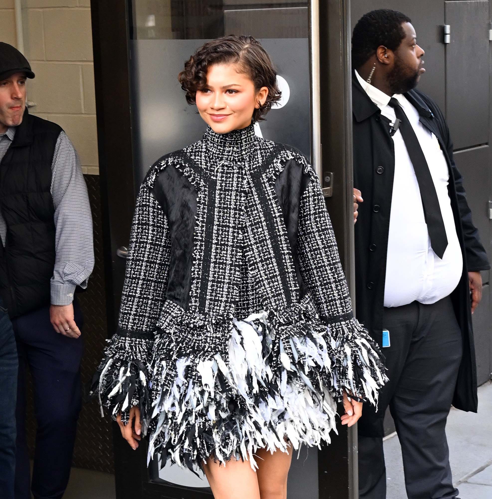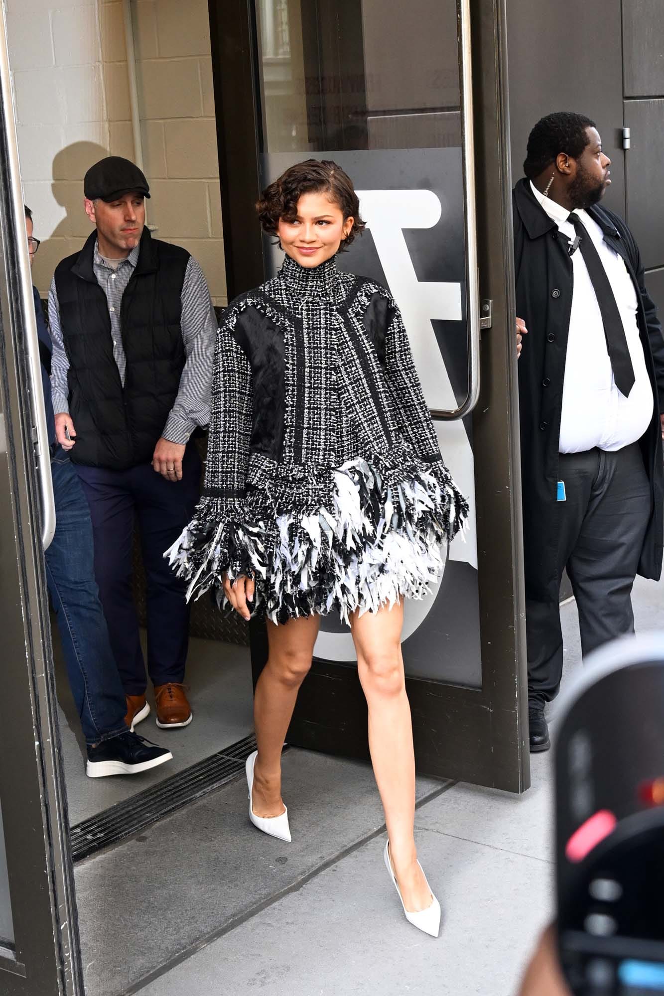 Anyway, Zendaya and Robert Pattinson are making their final press push for The Drama. They were in New York yesterday, making multiple appearances. Zendaya was at Good Morning America in the morning, in a cute tulle overlay outfit:
