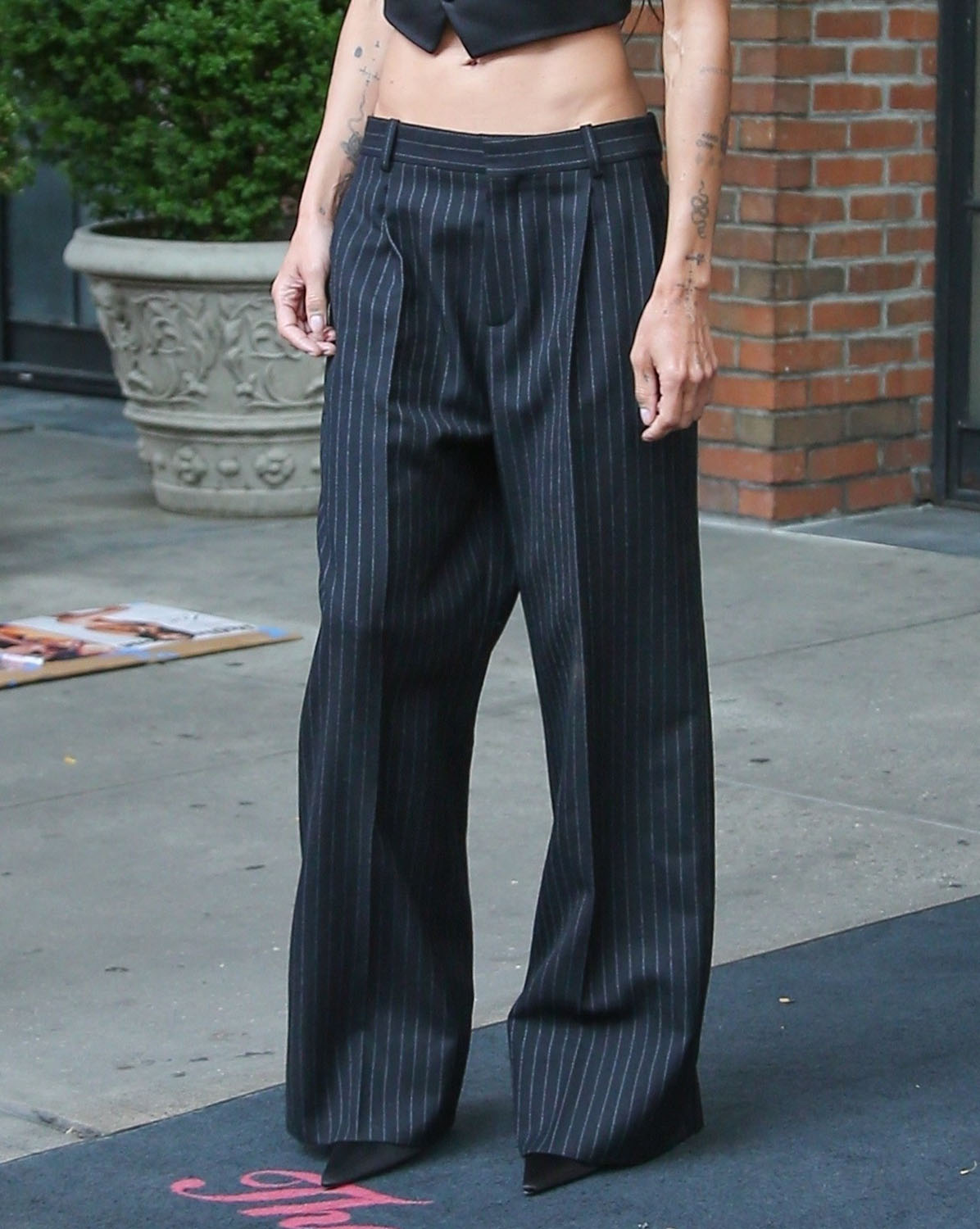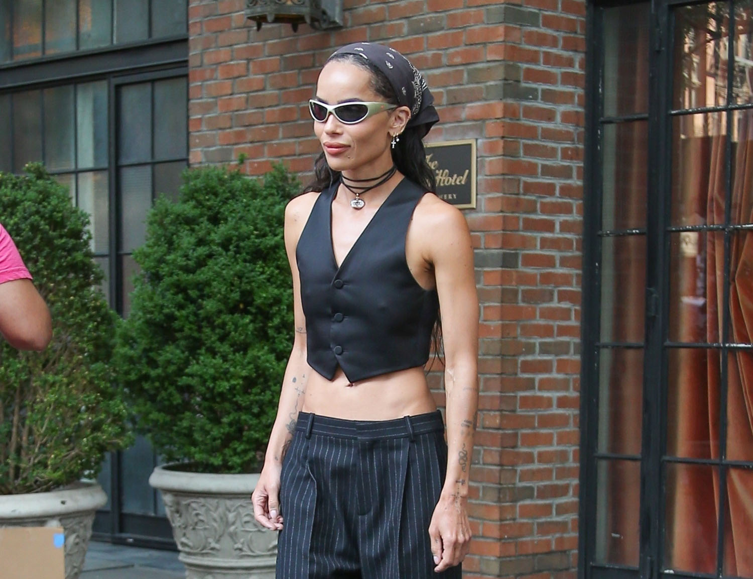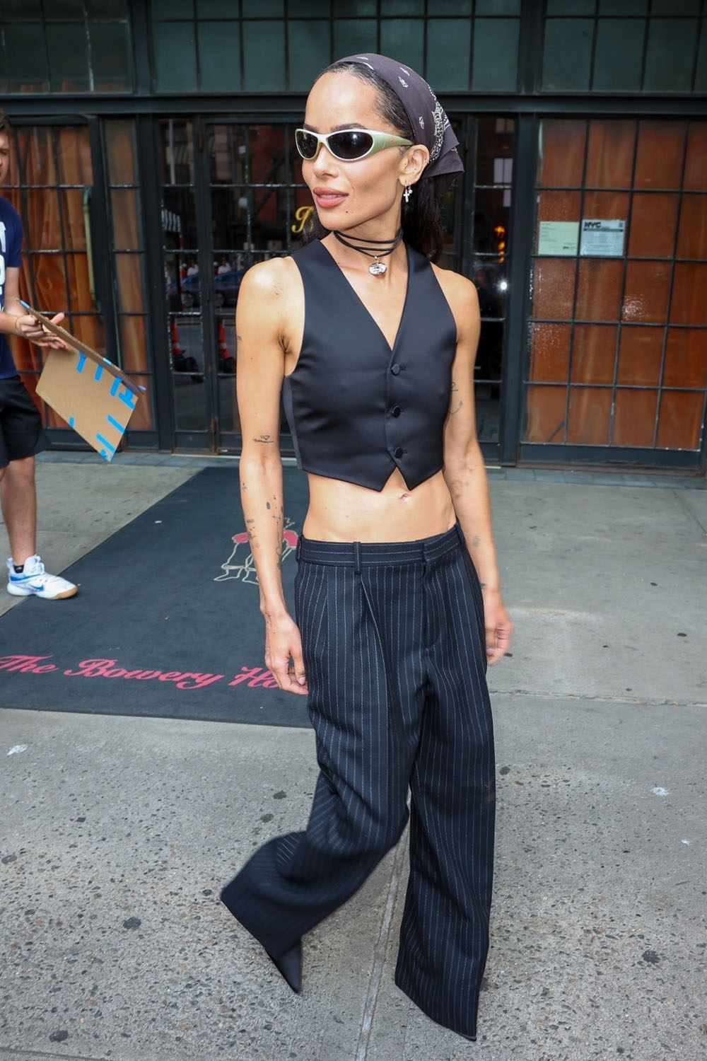 Zoë was not in Puerto Rico with Austin, Bad Bunny, and Darren Aronofsky but the junket is this coming weekend and there’s no doubt she’ll be on the carpet with the team for the premiere. In the meantime, let’s enjoy this outfit – a pinstripe set, cropped waistcoast over a pair of exquisitely tailored trousers. I don’t even have to check and I know this is Saint Laurent, she’s an ambassador, and if you want and can afford the pants, you can get them here, on sale for $2,200, LOL.