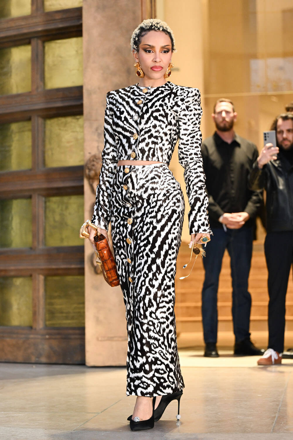 And Doja Cat turned up at the Schiaparelli show once again, this time in two-piece animal print, very Eighties inspired. This look has been dubbed “mob wife”.