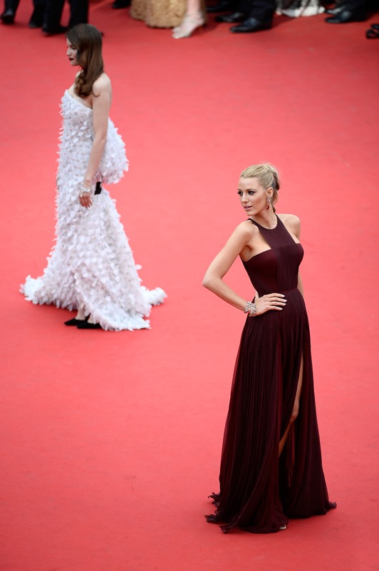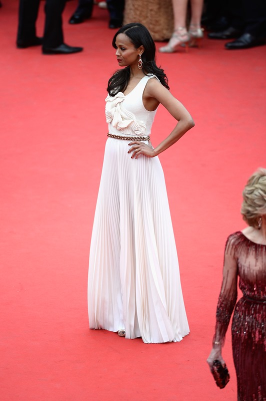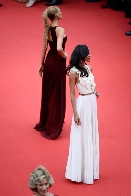 Cannes opening night. Zoe Saldana and Blake Lively at the Palais, both representatives of L’Oreal. Side by side, back and forth, one all in white, the other all in brown.