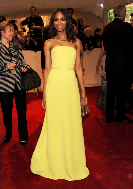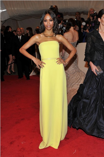 It’s bright yellow and I’m calling it boring. Because it is. It’s strapless. It’s that trademark Calvin Klein seemingly super-industrial wrinkle resistant material. There’s a belt at the waist. With some flaps at that back. And... that’s it.